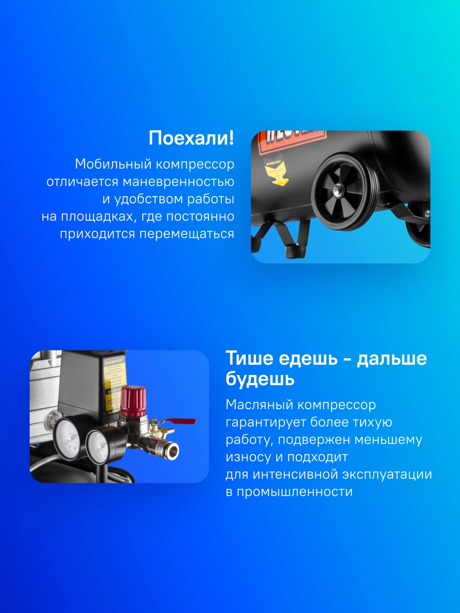 Масляный компрессор с прямым приводом для мастерской, гаража или предприятия. Двигатель мощностью 2200Вт нагнетает до 330л воздуха в минуту. Совместим с дрелями, гайковёртами, краскопультами и т.д. Вместительный ресивер на 50л позволяет реже включать двигатель для подкачки воздуха.