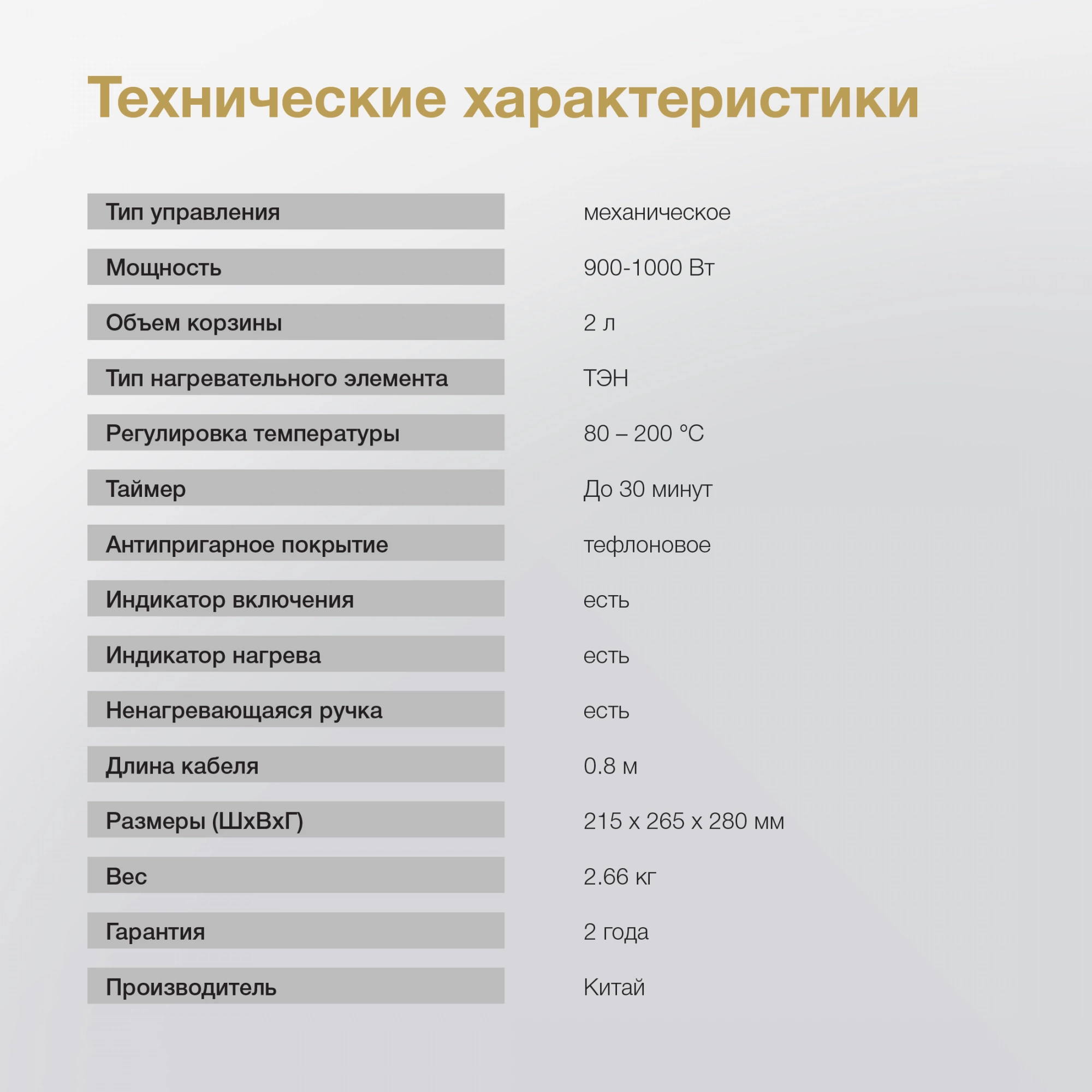 Аэрогриль оснащён управлением температуры и времени, вам не придётся контролировать процесс приготовления лично, достаточно установить температуру и время.