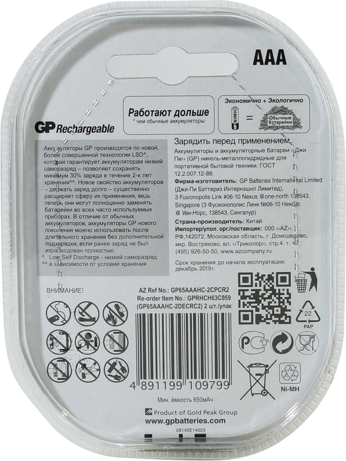 Аккумулятор GP 65AAAHC-2/ 2DECRC2-2/ 5DECRC2 (1.2V, 650mAh) NiMh, Size" AAA" < уп. 2 шт>