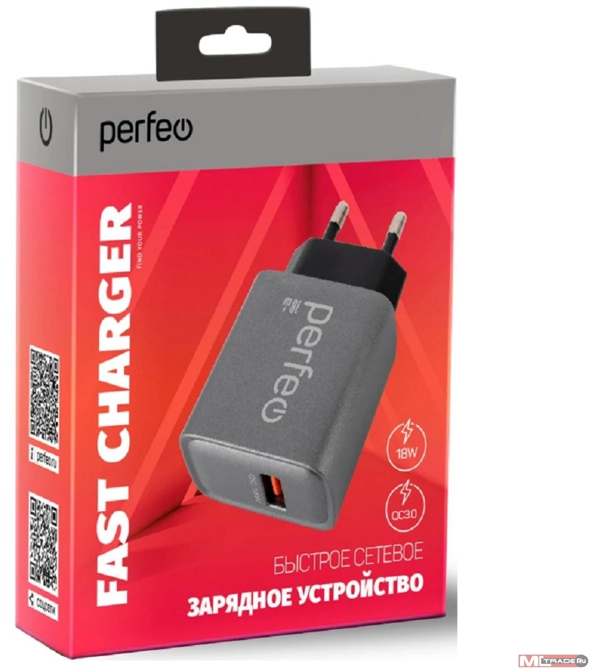 Аксессуар PERFEO Сетевое зарядное устройство с разъемом USB, QC3.0, 18W, серый (I4667)