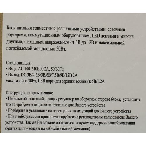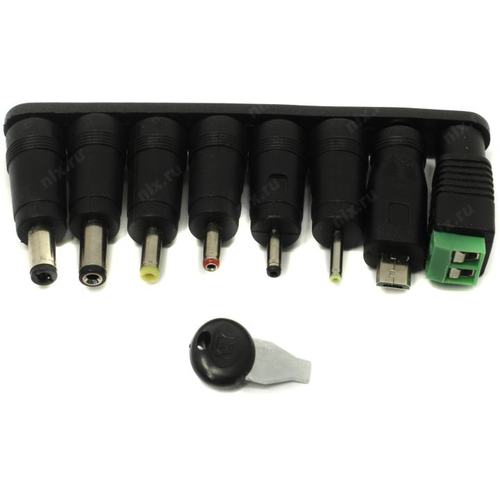 Универсальный адаптер питания для аксессуаров и периферийных устройств. Может использоваться для роутеров, коммутационного оборудования, светодиодных лент и прочих устройств с напряжением питания до 12 вольт и мощностью до 24 Вт. Дополнительно присутствует USB выход для зарядки мобильных устройств, максимальный ток 1.2А. Среди переходников имеется разъем micro USB и зажимы для проводов.