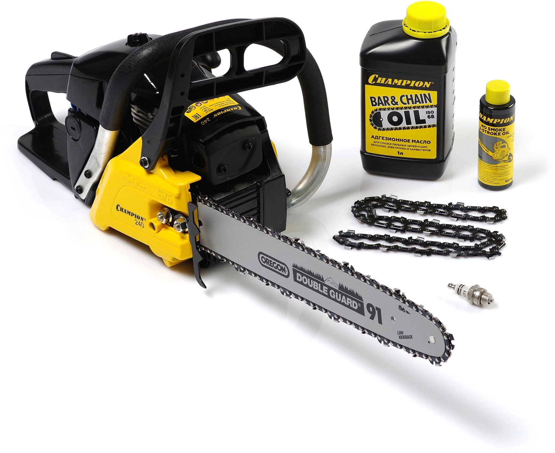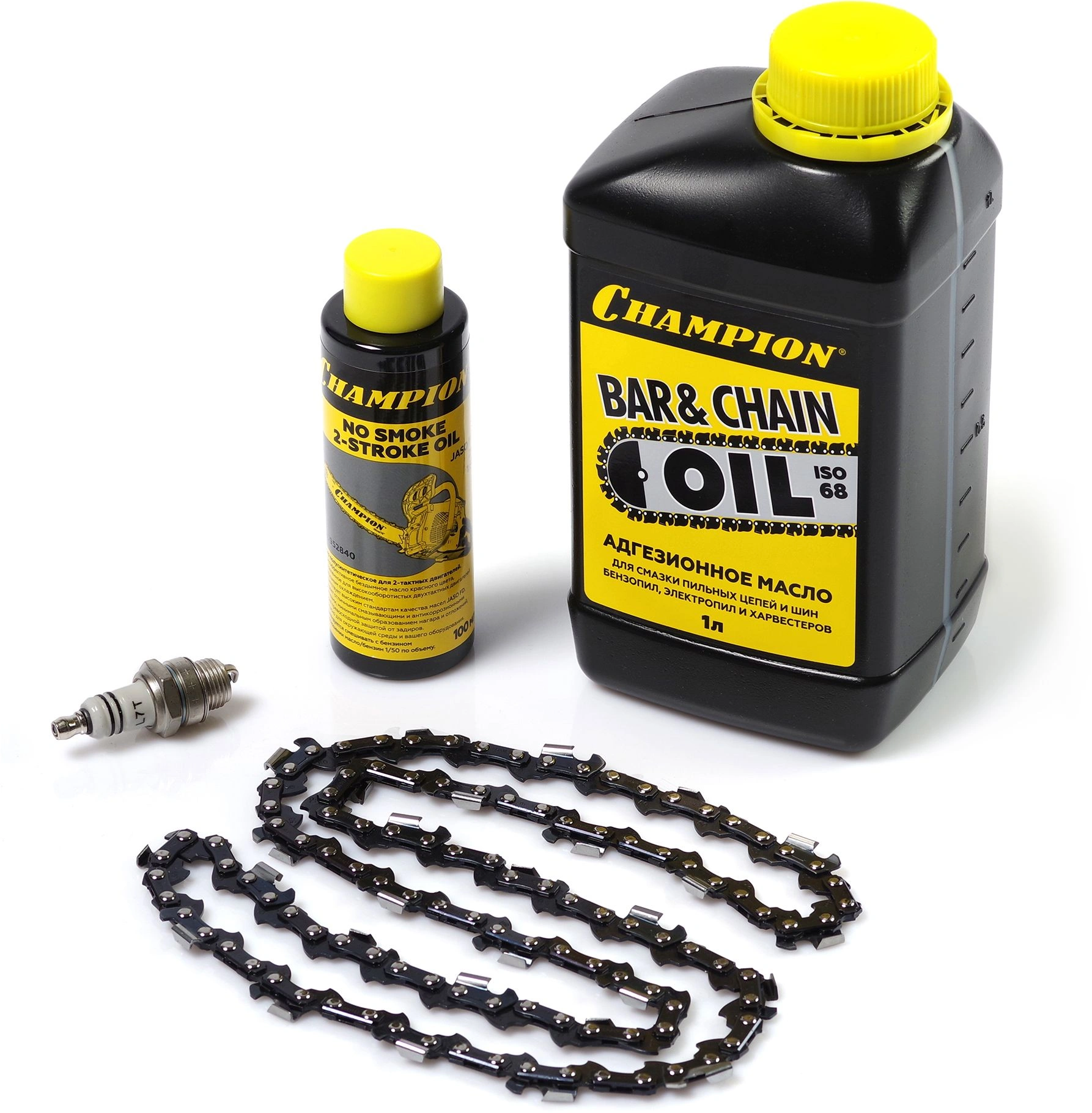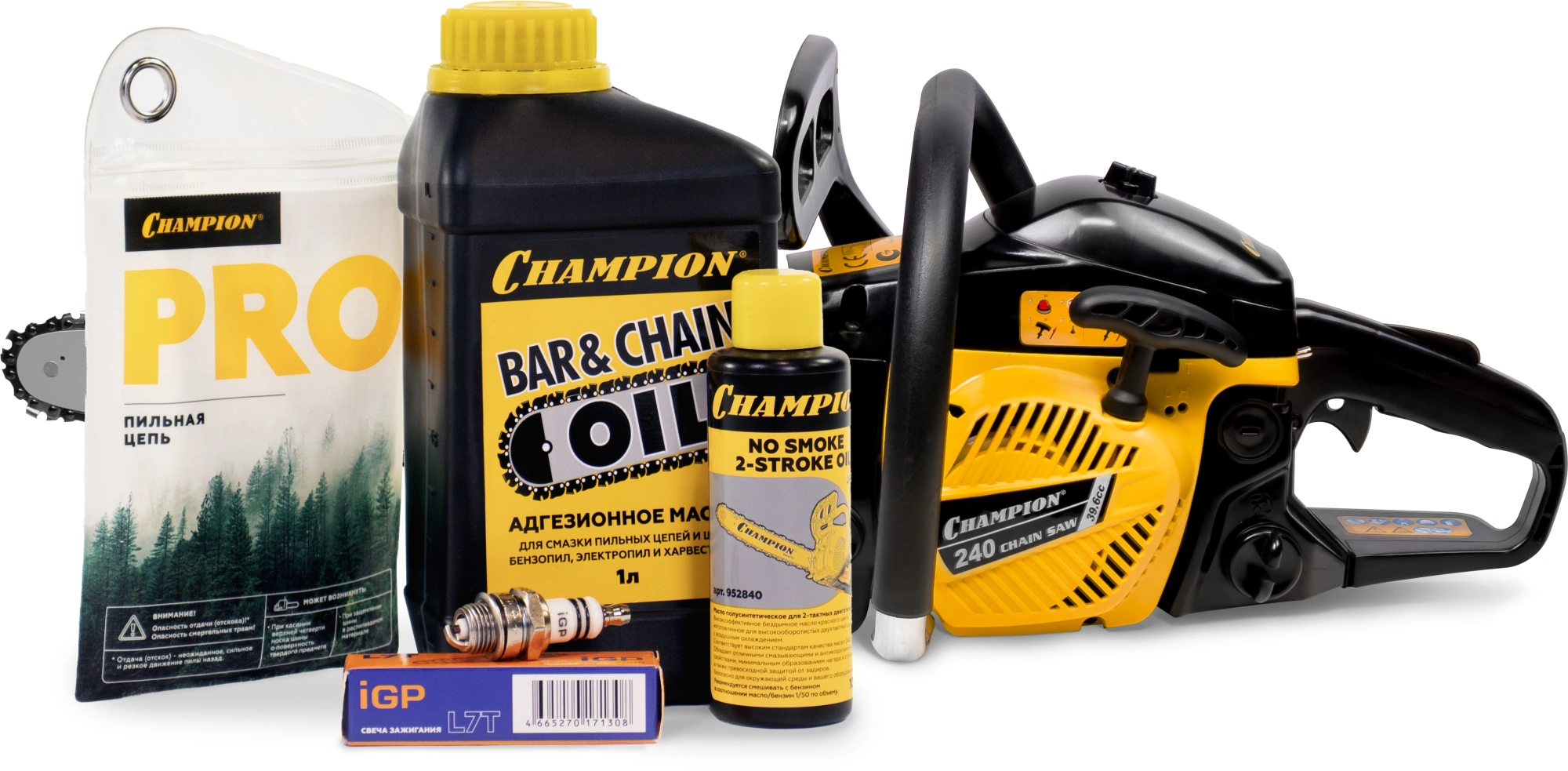Бензопила,  направляющая шина,  цепь пильная,  емкость для приготовления топливной смеси,  защитный чехол,  крышка шины,  отвертка,  свечной ключ,  ключ Г-образный шестигранный,  упор зубчатый,  масло для смазки 1 л,  свеча зажигания IGP L7T,  масло для 2-такных двигателей Jaso FD 0,  инструкция