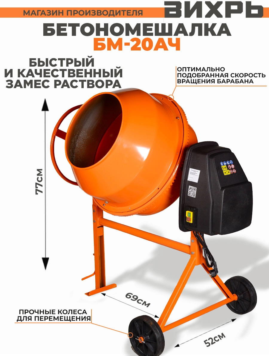 Бетономешалка Вихрь БМ-20АЧ 74/1/20 - строительный инструмент, используемый для приготовления различных видов строительных смесей и бетонного раствора. Востребована при строительстве домов в несколько этажей. В час агрегат способен производить более 2 куб.м. раствора.