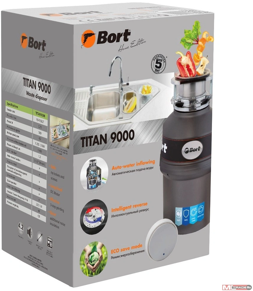 Блендер Bort Измельчитель пищевых отходов TITAN 9000 (Мощность 560 Вт; Объем камеры 1450 мл; Мощность л.с. 0,75 Размер 360х190 мм; 8.6 кг; 44,8 x 30.7 x 24,8; гарантия 2 г) [93415827]