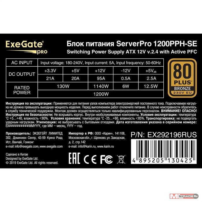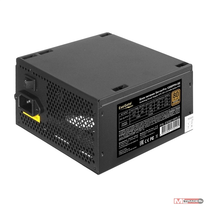 Блок питания Exegate EX292196RUS Серверный БП 1200W ExeGate ServerPRO 80 PLUS® Bronze 1200PPH-SE (ATX, for 3U+ cases, APFC, КПД 89% (80 PLUS Bronze), 12cm fan, 24pin, 2x(4+4)p, 6xPCI-E, 8xSATA, 4xIDE, box, black)