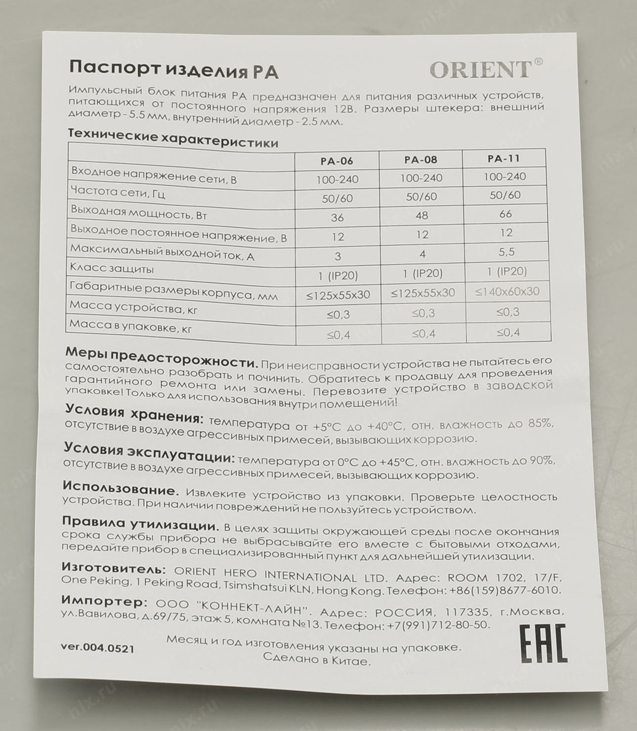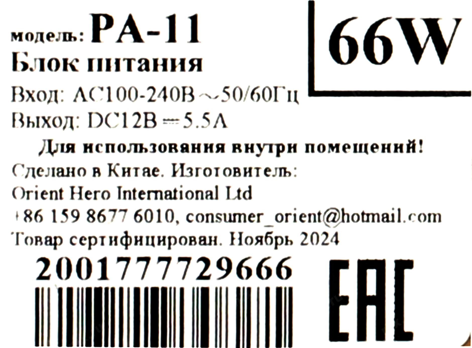 Блок питания Orient < PA-11> (Вх. AC100-240V, Вых. DC12V, 5500mA)