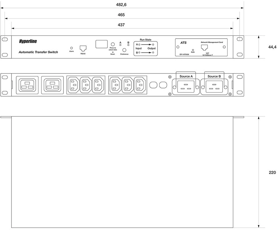 Блок розеток Hyperline ATS-R-128H0812-Intelligent Блок розеток с функцией авт. включения резервного питания (АВР/ATS) 19", горизонт., 1U, 6хIEC320 C13, 2хIEC320 C19, 220V, 16А, каб. пит. 3х1.5 мм2 вилка DIN 49441 16A, со встр. мод. ATS-SNMP, 482.6 ммх220.0 ммх44.4 мм (ATS-R-228H1622-Intelligent)