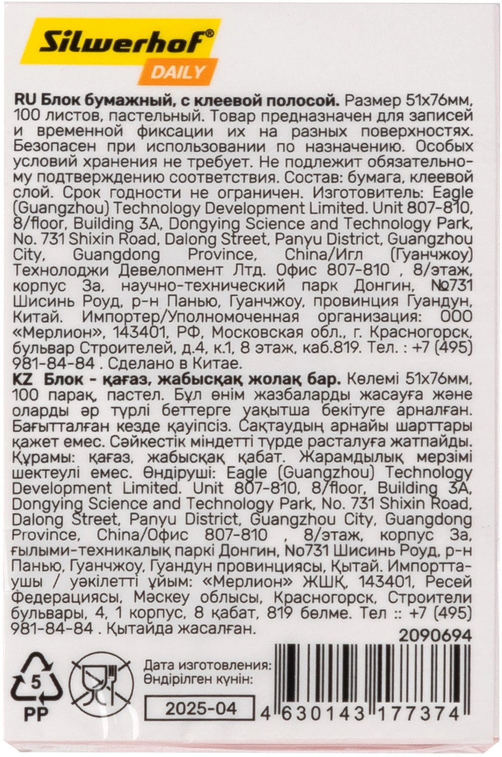 Блок самоклеящийся бумажный Silwerhof Daily 51x76мм 100лист. 75г/ м2 пастель розовый (продается кратно 12 шт.)