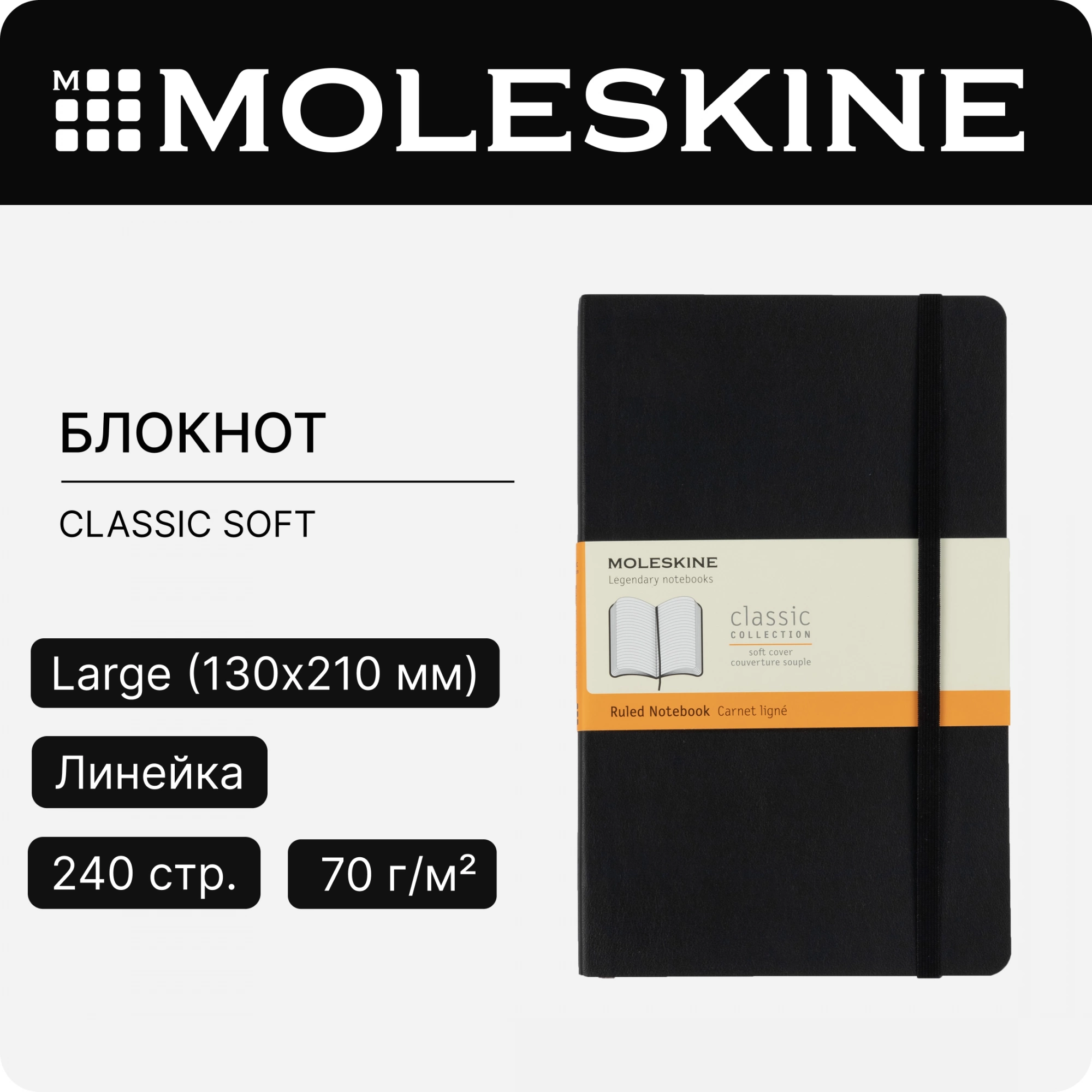 Этот простой, но уже ставший классикой блокнот в линейку размера large является одним из самых популярных изделий Moleskine. Этот надежный спутник, идеально подходящий для записи мыслей, идей и заметок, снабжен закладкой, эластичной застежкой и вместительным внутренним карманом.