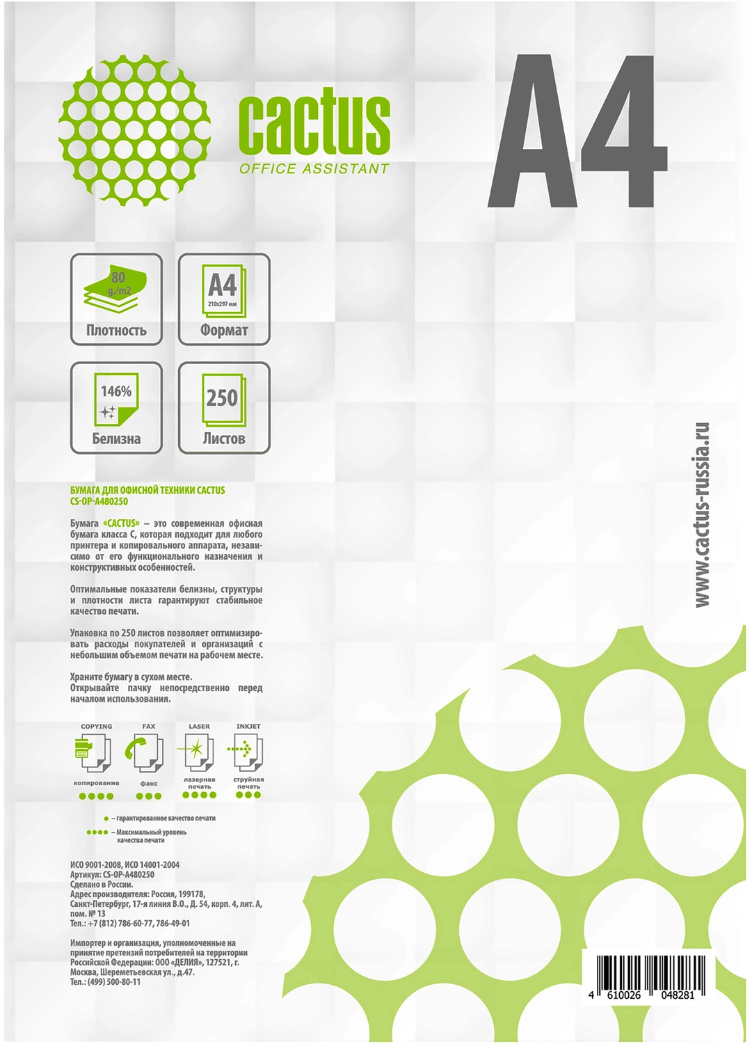 Бумага белая офисная Cactus CACTUS Бумага белая офисная A4/ 80г/ м2/ 250л./ белый CIE146% (отпускается по 1 пачке - 250 листов) [CS-OP-A480250]