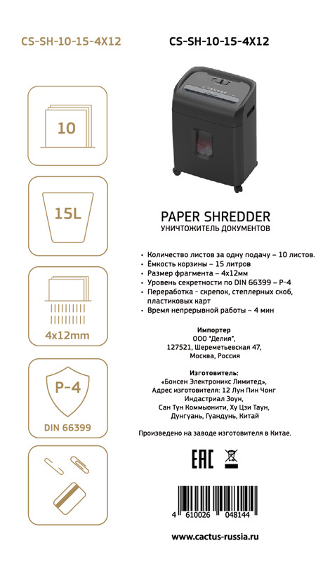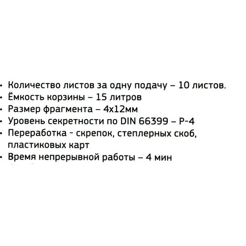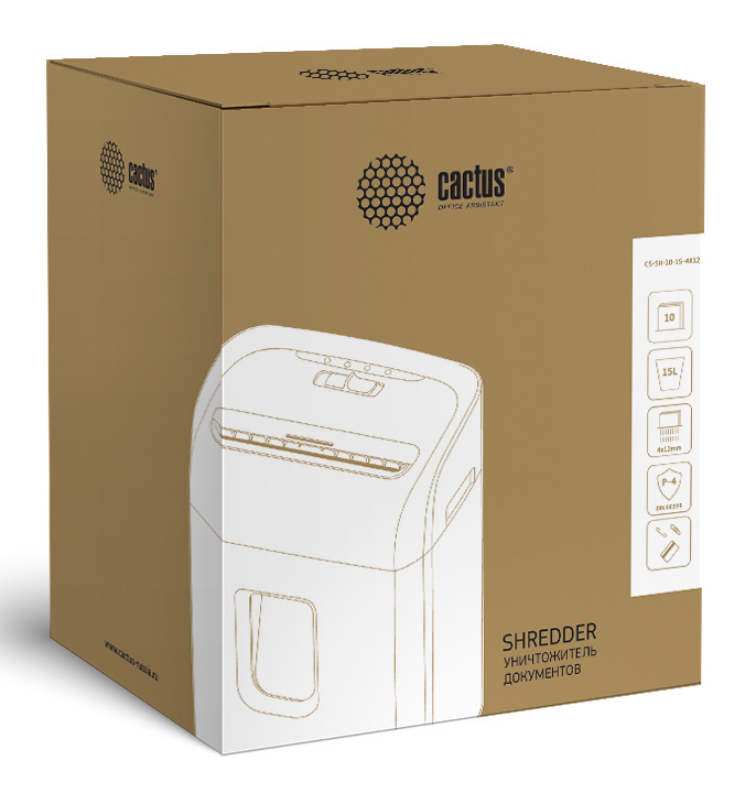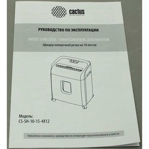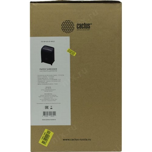 Шредер Cactus CS-SH-10-15-4X12 (секр.P-4) перекрестный 10лист. 15лтр. скрепки скобы пл.карты