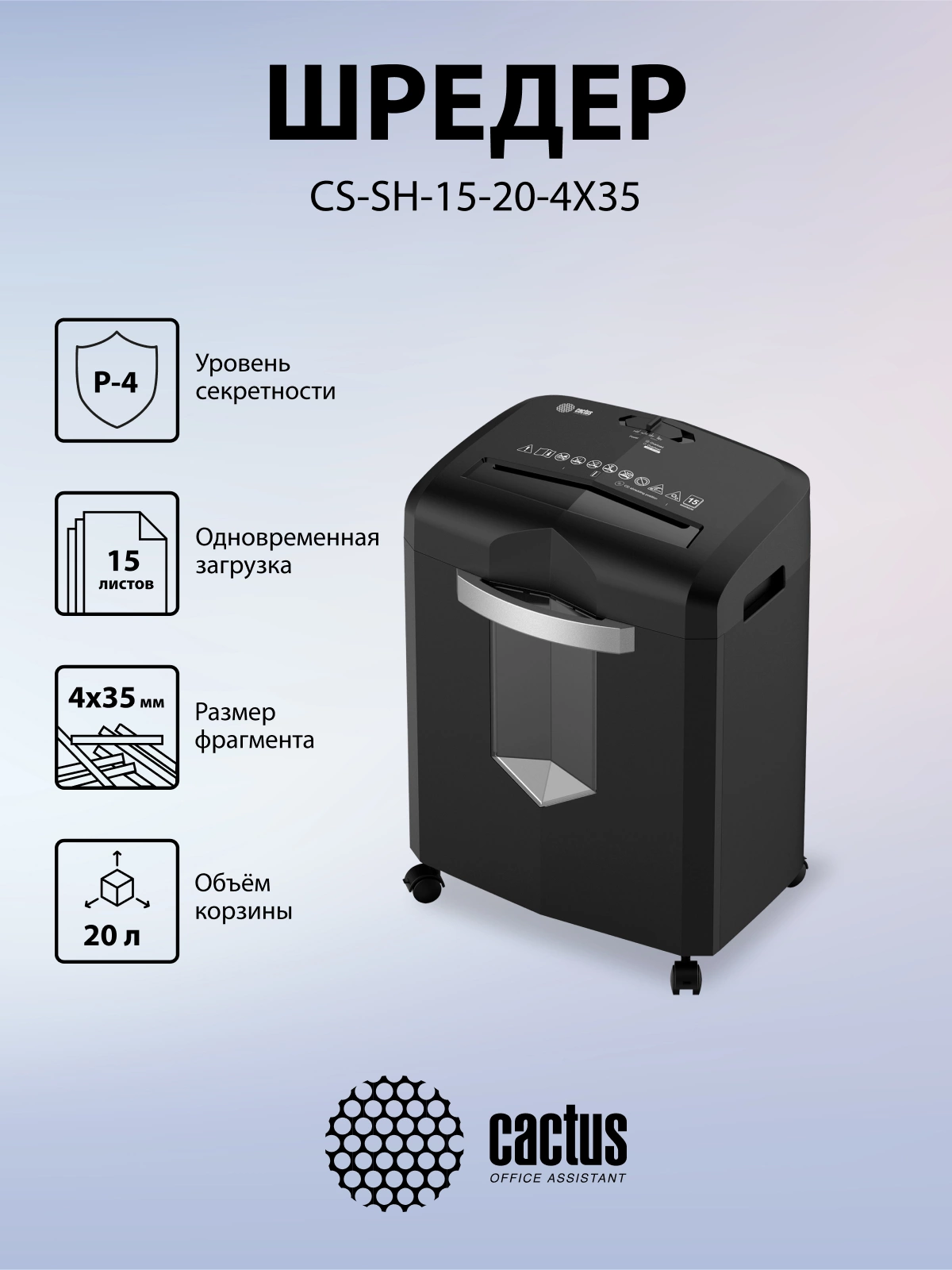 Шредер Cactus CS-SH-15-20-4X35 (секр.P-4) фрагменты 15лист. 20лтр. скрепки скобы пл.карты CD | НИКС Екатеринбург