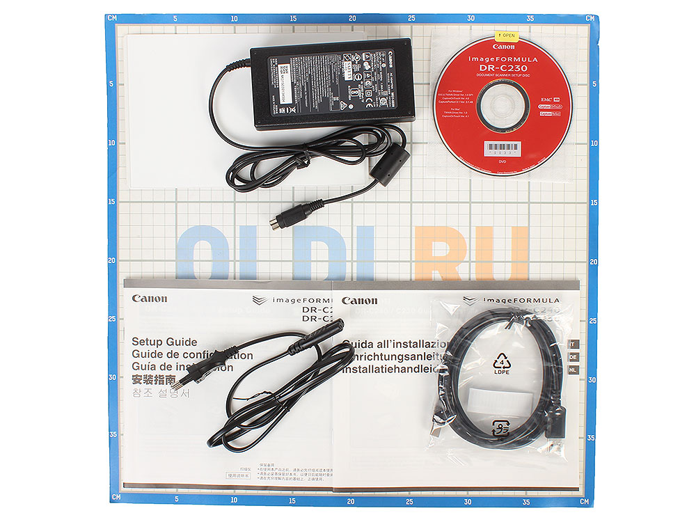 Сканер, Лоток подачи, Установочный диск, Документация, USB-кабель, Блок питания переменного тока, Кабель питания