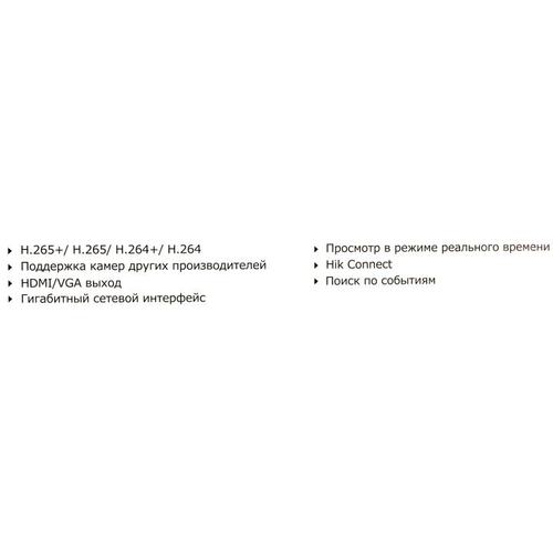 Бесплатное приложение для мобильных устройств на базе iOS и Android OS (просмотр изображения с камеры на мобильном устройстве);;Режимы записи: Постоянно, по расписанию, по детектору движения;;USB порт для подключения внешних накопителей (экспорт записанного видео);;Возможности воспроизведения: 1 канал 8 МП (30 к/с) или 5 каналов 1080p (30 к/с)