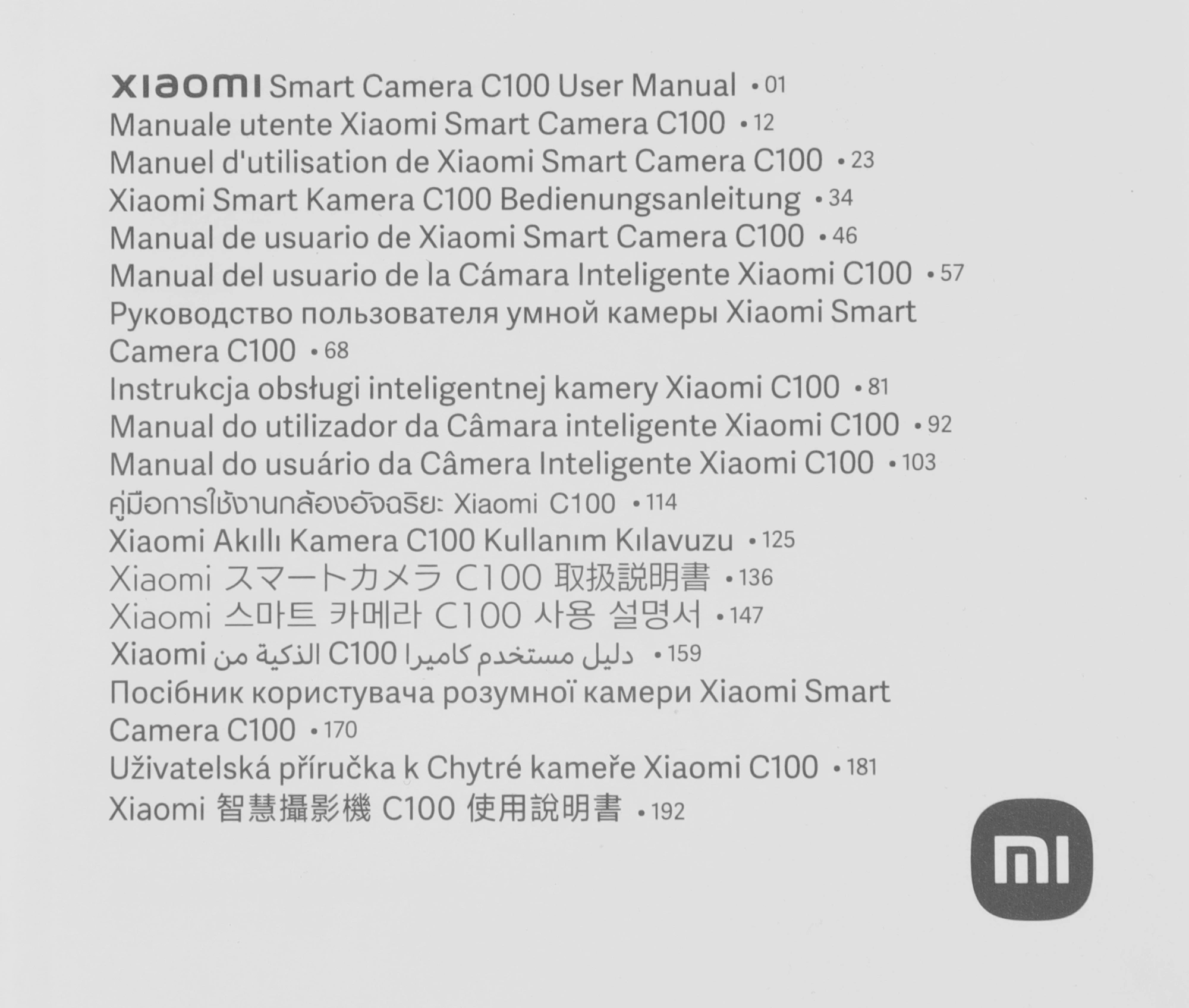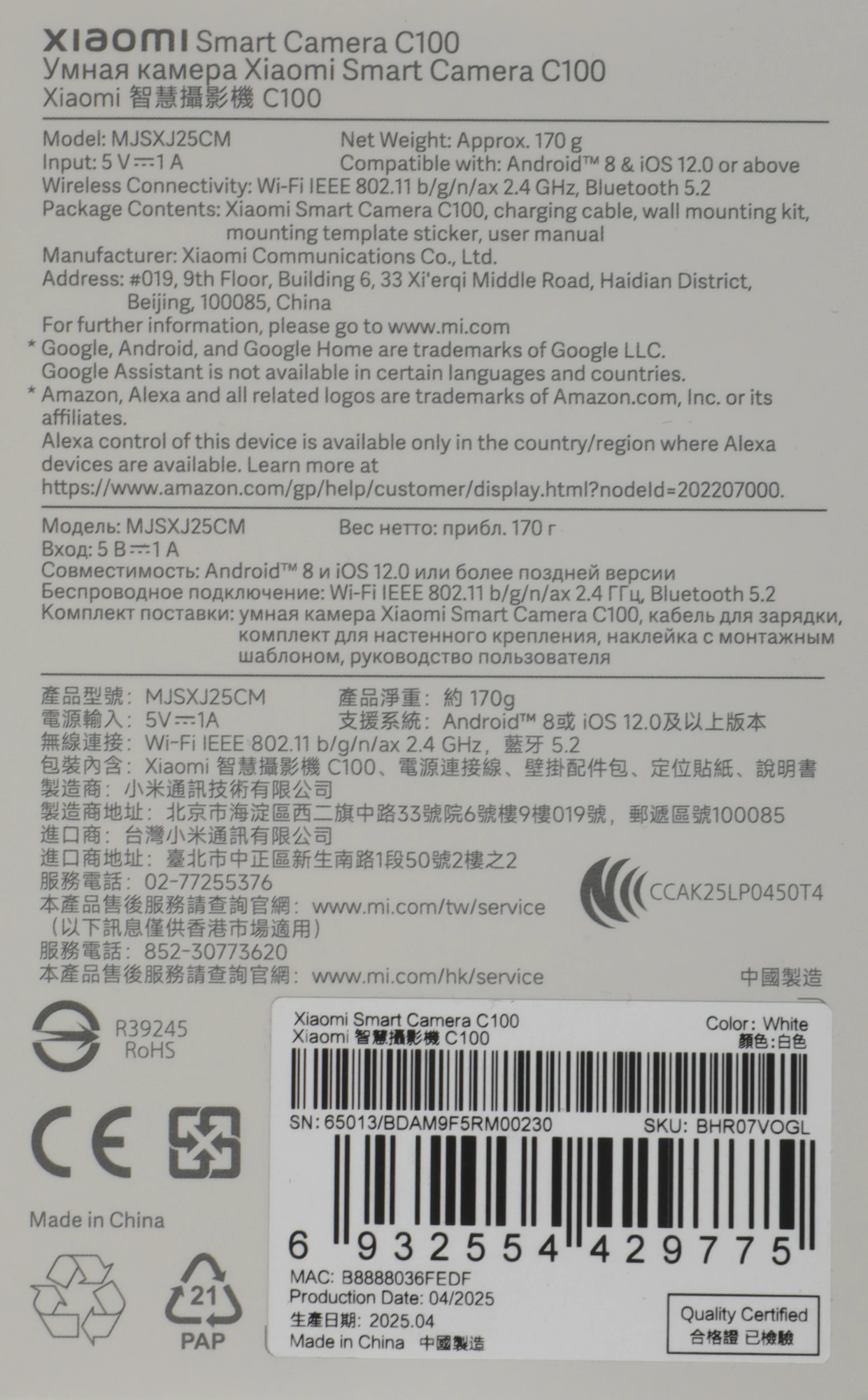 Умная камера Xiaomi Smart Camera C100; кабель для зарядки; комплект для настенного монтажа; монтажная наклейка; руководство пользователя