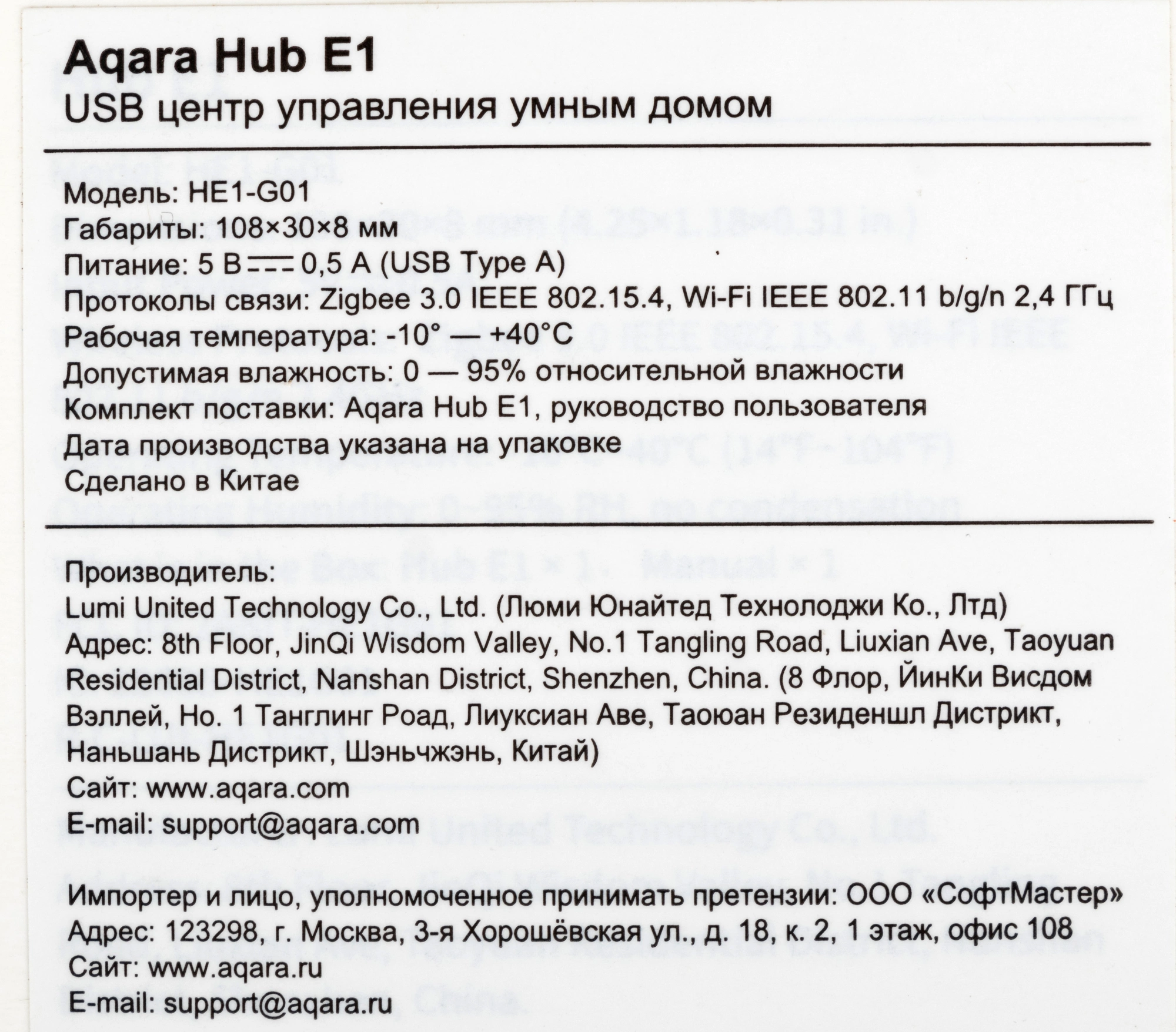 Наличие Wi-Fi 2.4 ГГц, мобильное приложение Aqara Home