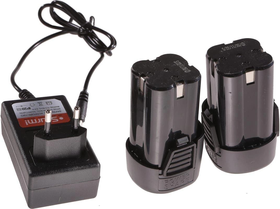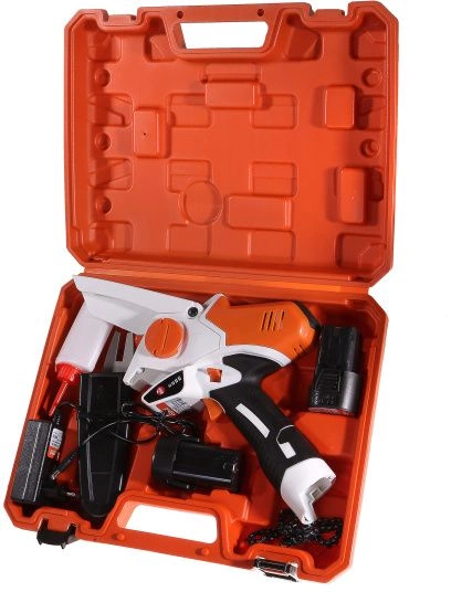 Пила цепная, пильная шина, пластиковый защитный кожух шины, пильная цепь, аккумуляторная батарея (2 шт) , бутылка для масла, зарядное устройство, инструкция по эксплуатации, инструкция по безопасности