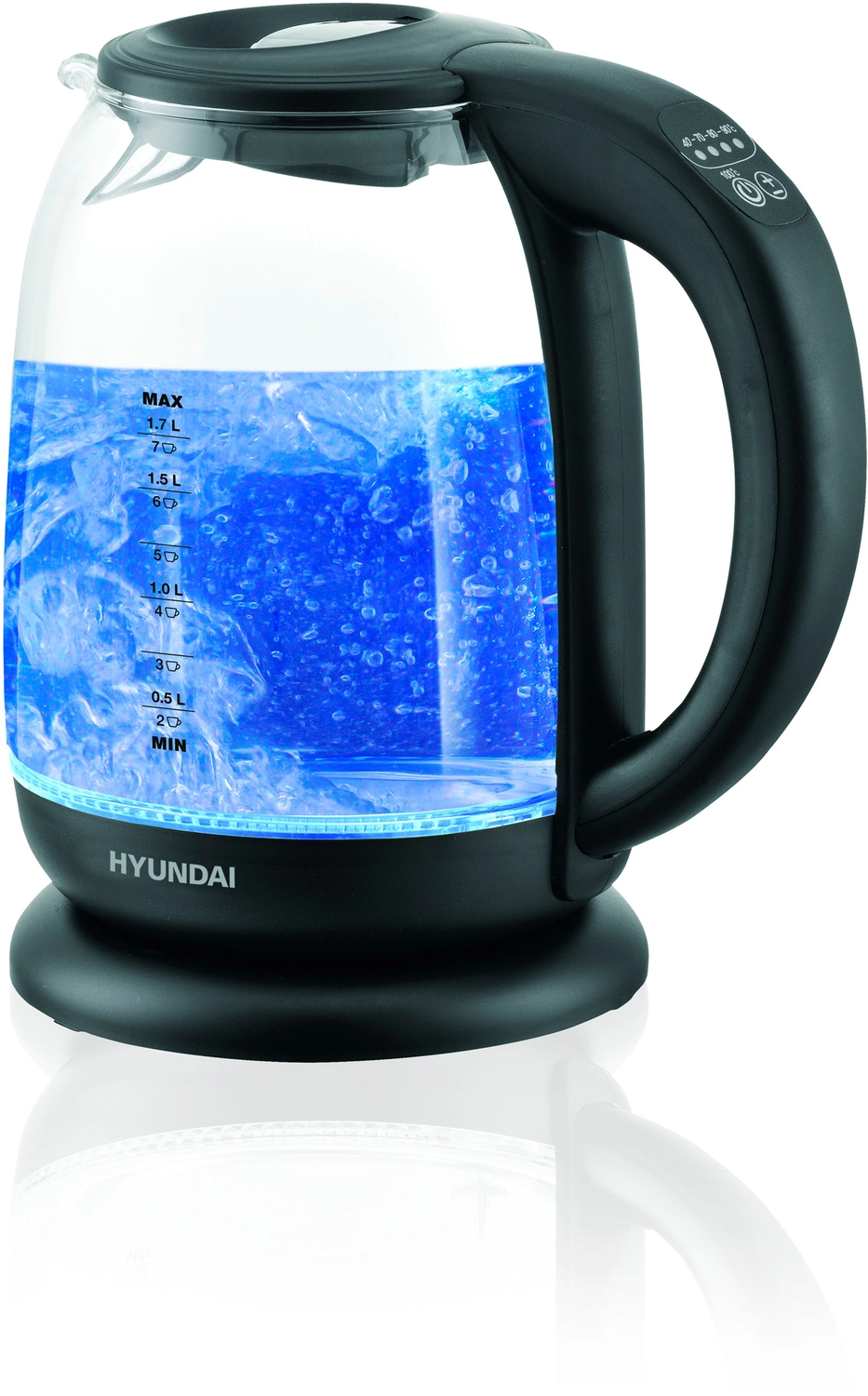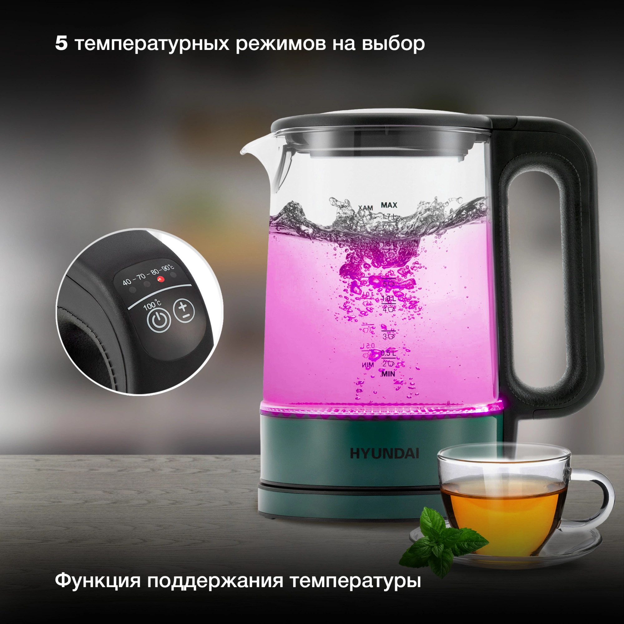 Оснащен панелью управления для выбора температуры и её индикации. Имеет красивую цветовую подсветку воды которая меняется в зависимости от температуры. 5 температурных режимов на выбор, а так же функция поддержания температуры.
