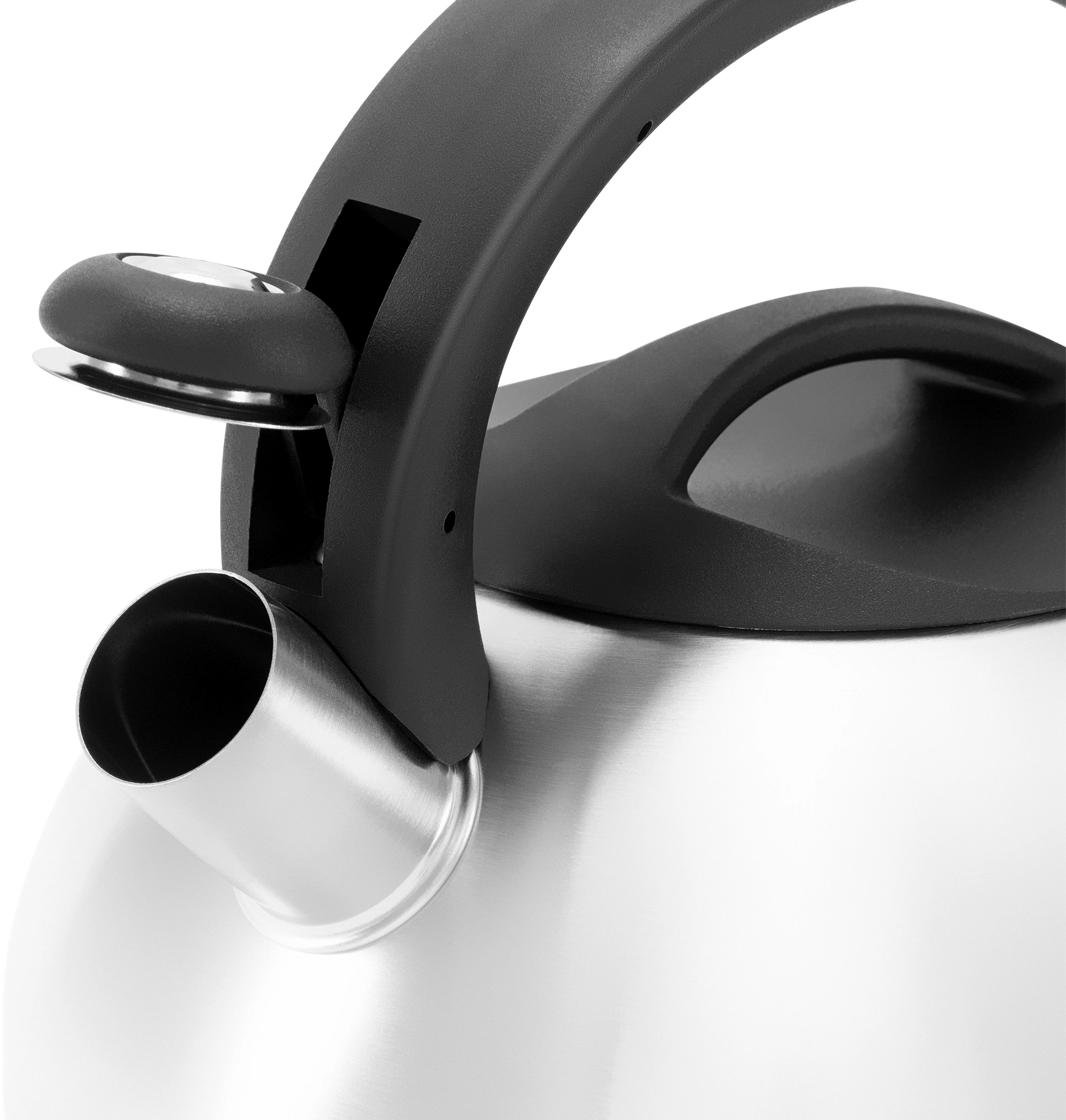 Изысканная сатинированная полировка корпуса. Аксессуары: прочная бакелитовая ручка. Преимущества: возможность налива воды одной рукой. Бакелитовый свисток со стальной сердцевиной и устройством для открывания носика на ручке. Упаковка: подарочная упаковка с ручкой.