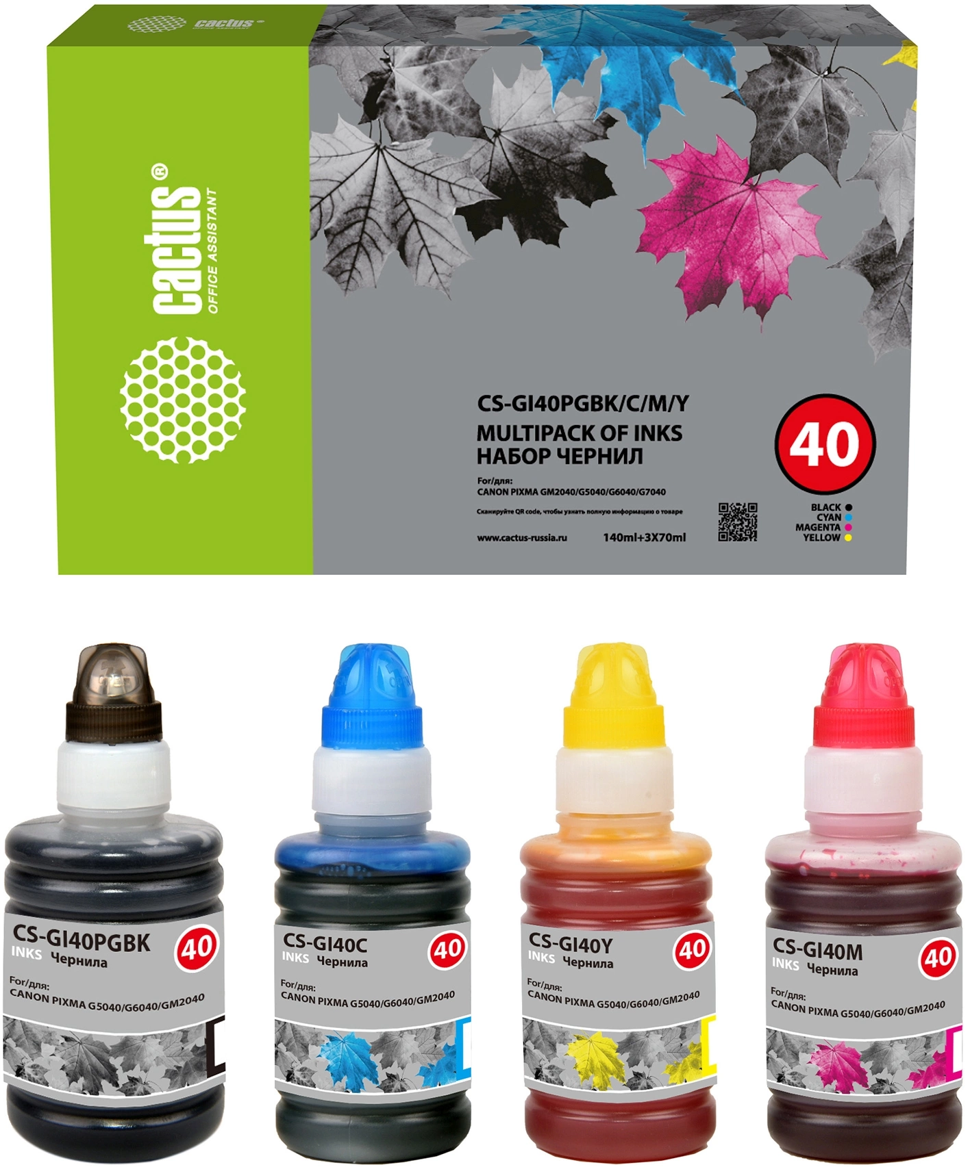 Чернила Cactus CS-GI40PGBK/ C/ M/ Y голубой/ пурпурный/ желтый/ черный набор для Canon Pixma G5040/ G6040/ GM2040