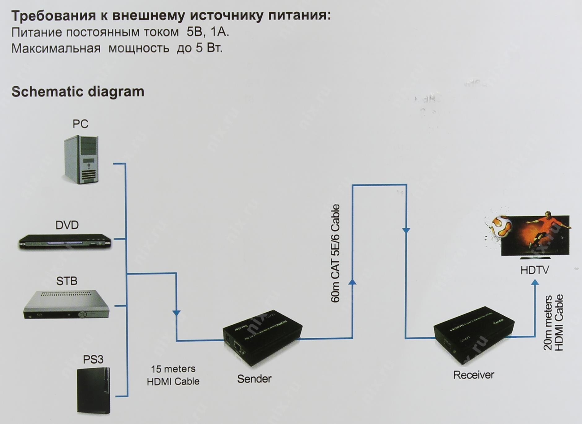 Устройство для передачи сигнала HDMI с максимальным разрешением 1920x1080 на расстояние до 60 метров через сетевой кабель.