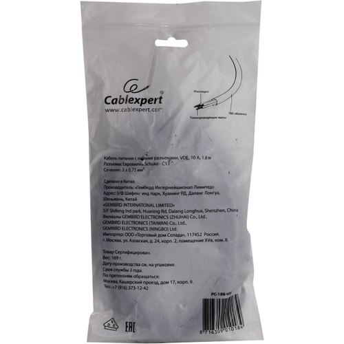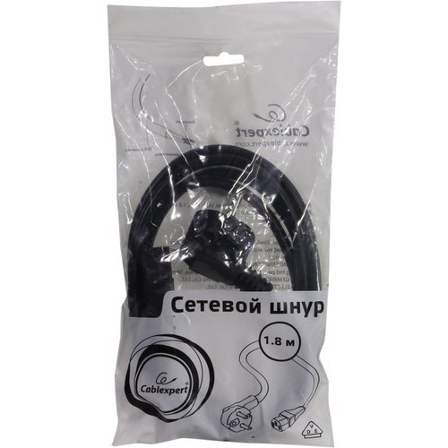 Кабель питания Cablexpert Schuko-C13, VDE, 3x0.75мм2, 10A, с заземлением, 1.8м, черный, пакет [PC-186-VDE]