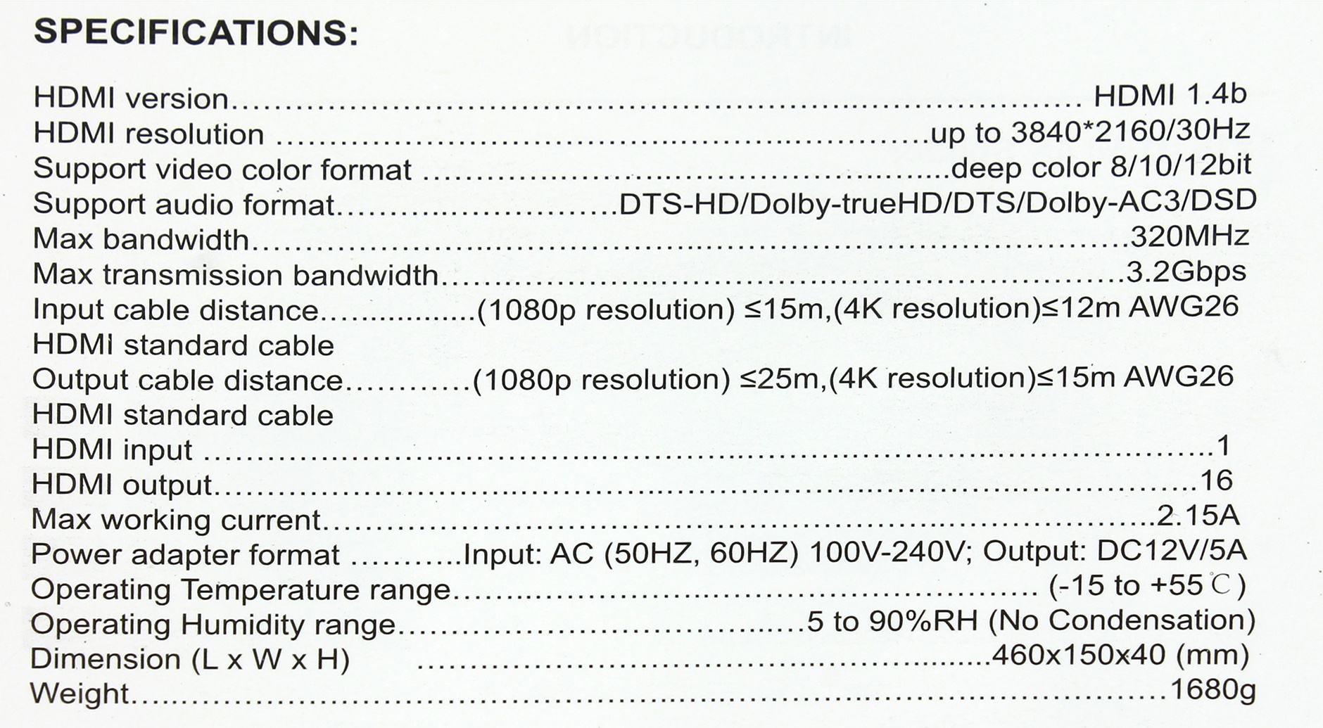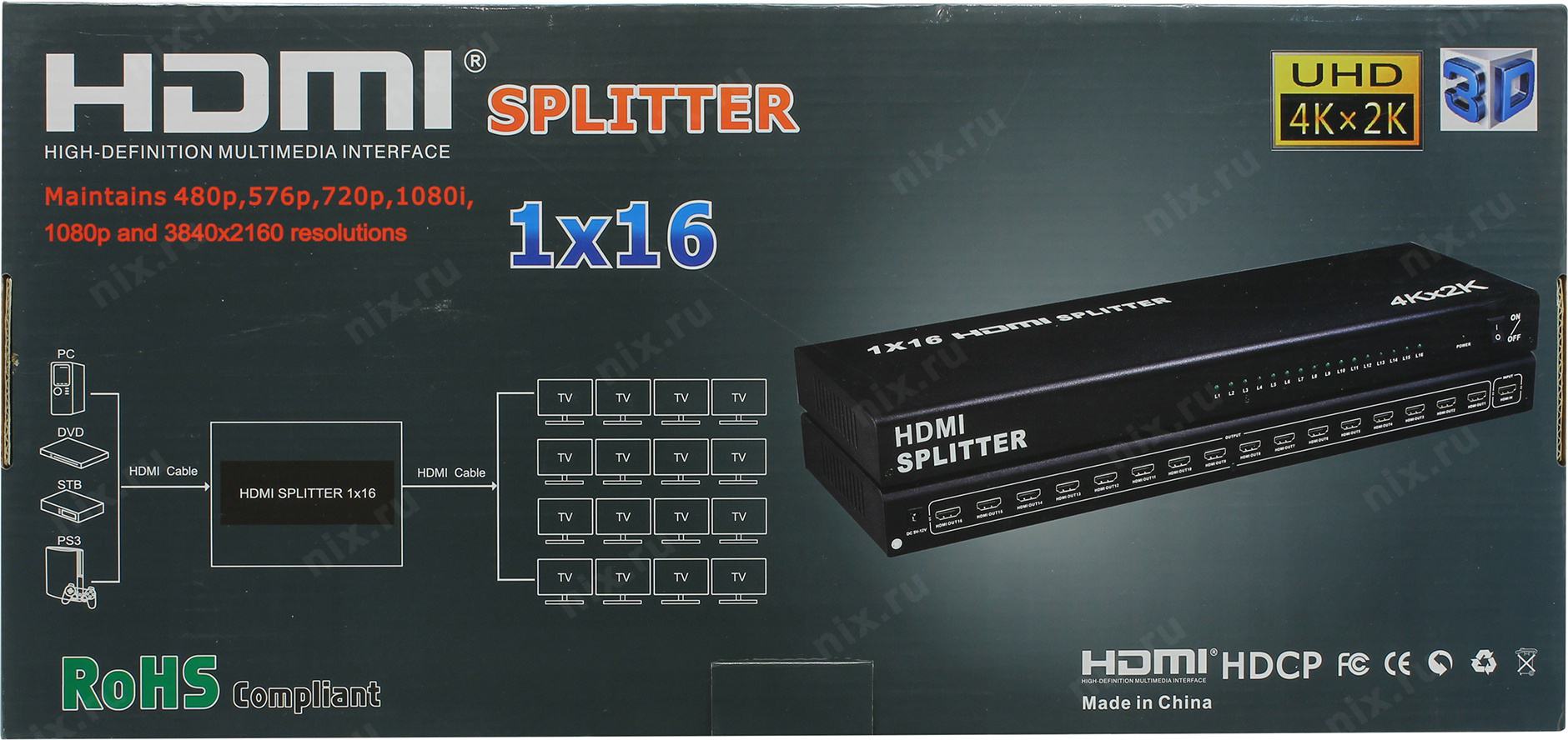 Сплиттер позволяет подключить к одному источнику цифрового HDMI видео/аудио сигнала (медиаплееру, TV ресиверу и др.) одновременно 16 телевизоров или мониторов. Поддерживается передача звука, 4K Ultra HD и 3D
