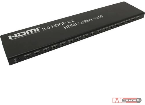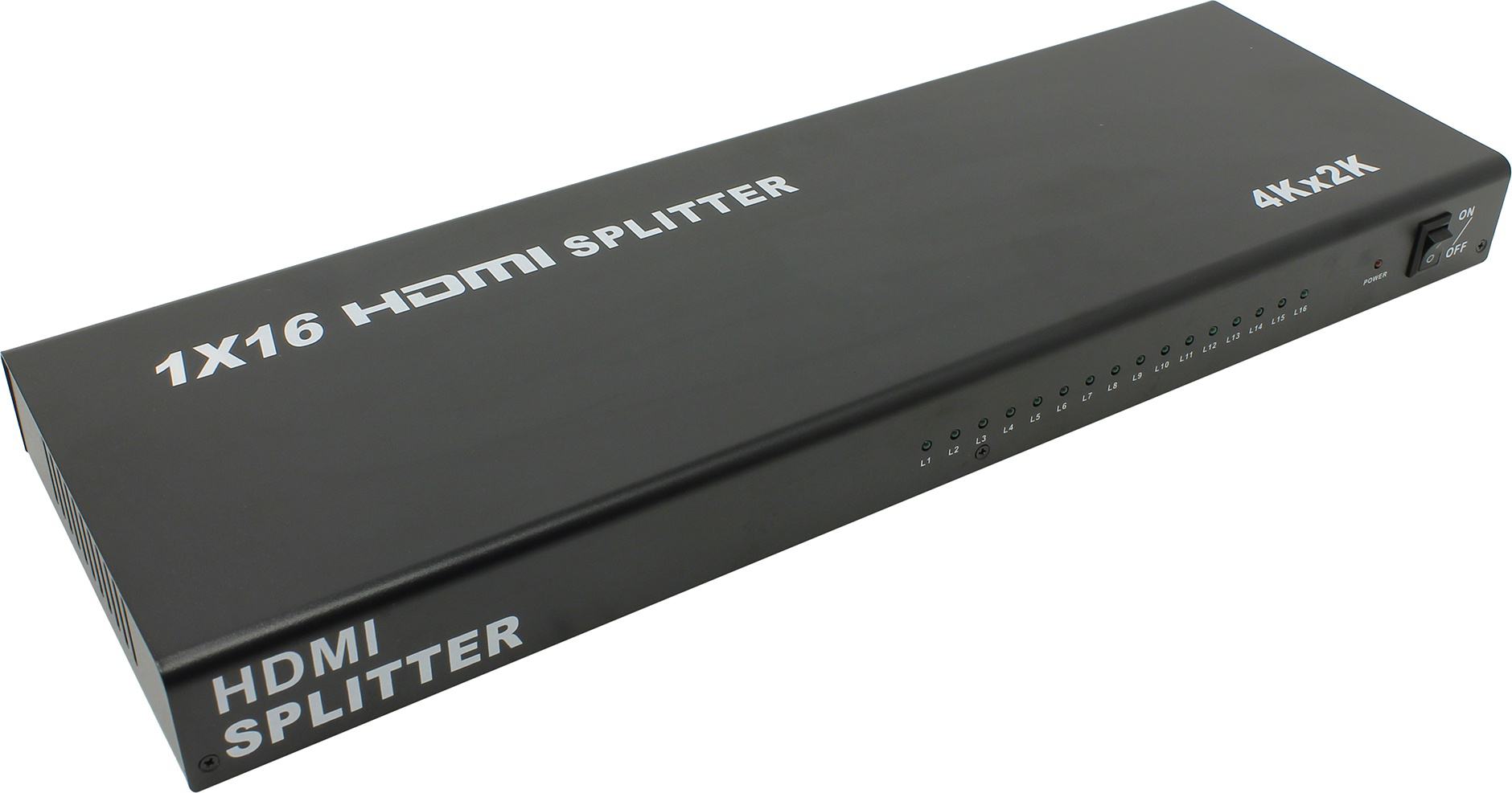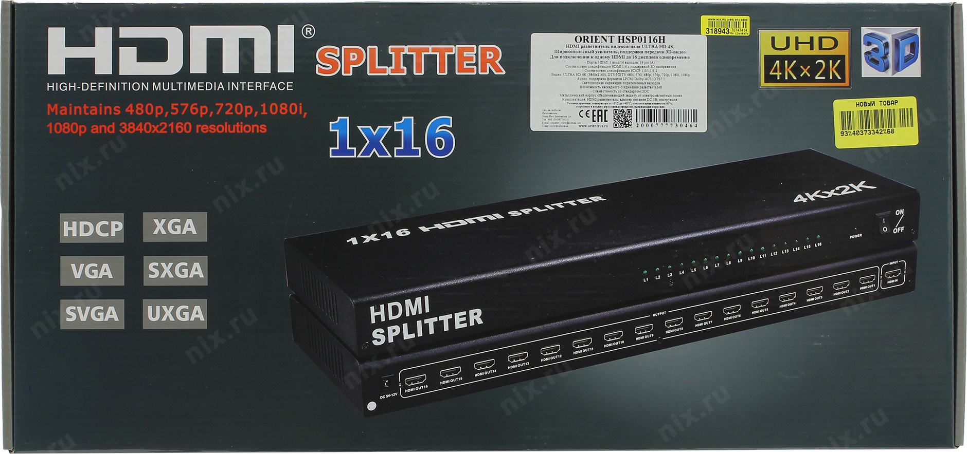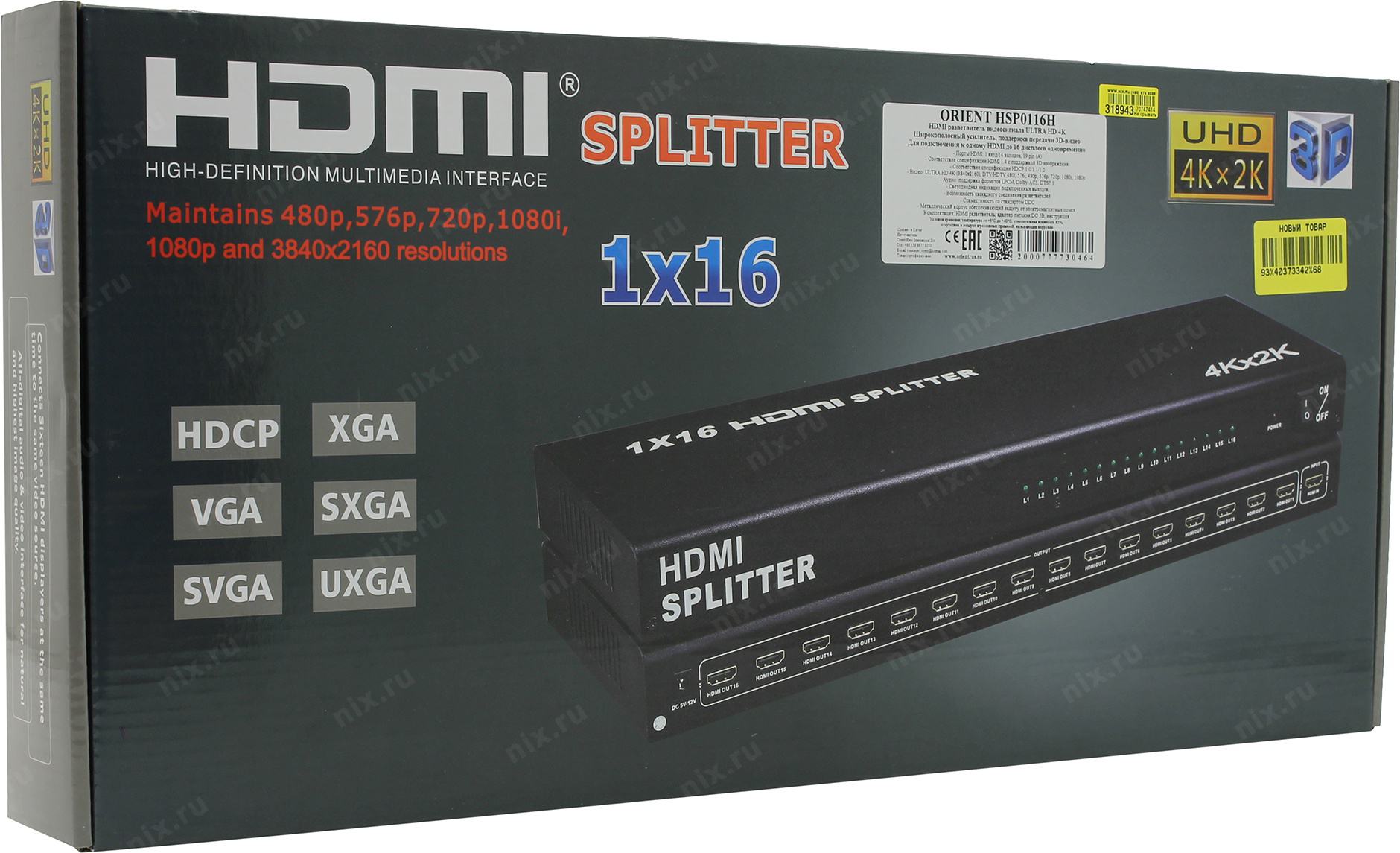 Переходник ORIENT HSP0116H-2.0, HDMI 4K Splitter 1->16, HDMI 2.0/3D, HDR, UHDTV 4K/ 60Hz (3840x2160)/HDTV1080p, HDCP2.2, EDID управление, RS232 порт, IR вход, внешний БП 5В/3А, метал.корпус (31097)