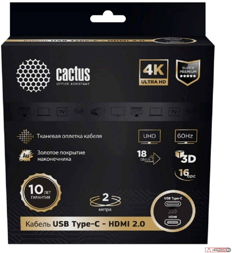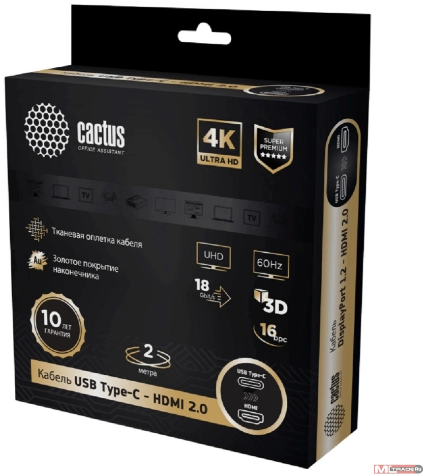 Кабель аудио-видео Cactus CS-USBC-HDMI-2-2 USB Type-C (m)/HDMI (m) 2м. позолоч.конт. черный