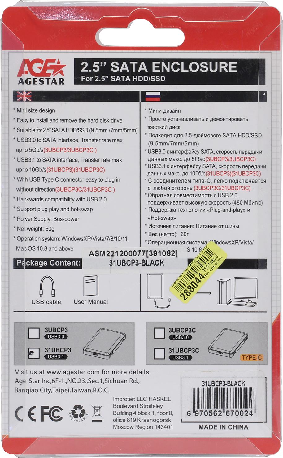 Мобильное шасси AgeStar <31UBCP3-Black>(Внешний бокс для 2.5" SATA HDD, USB3.1)