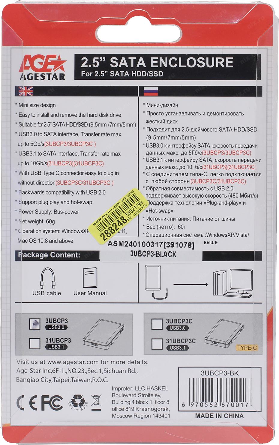 Мобильное шасси AgeStar <3UBCP3-Black>(Внешний бокс для 2.5" SATA HDD, USB3.0)