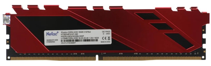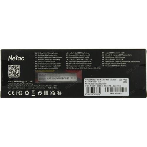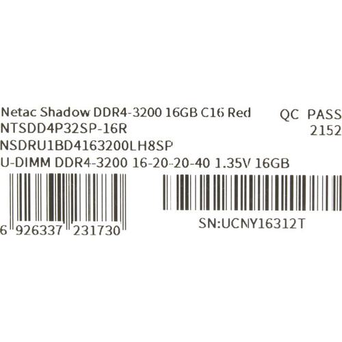 Память DDR4 16GB 3200MHz Netac NTSDD4P32SP-16R Shadow RTL Gaming PC4-25600 CL16 DIMM 288-pin 1.35В с радиатором Ret