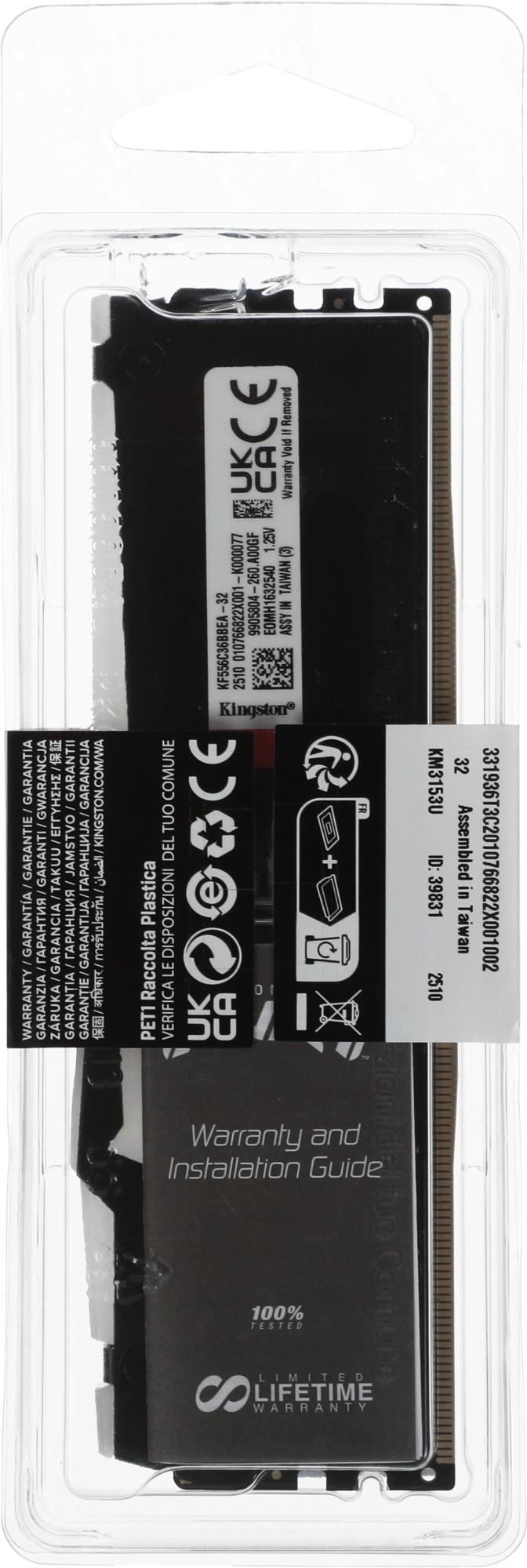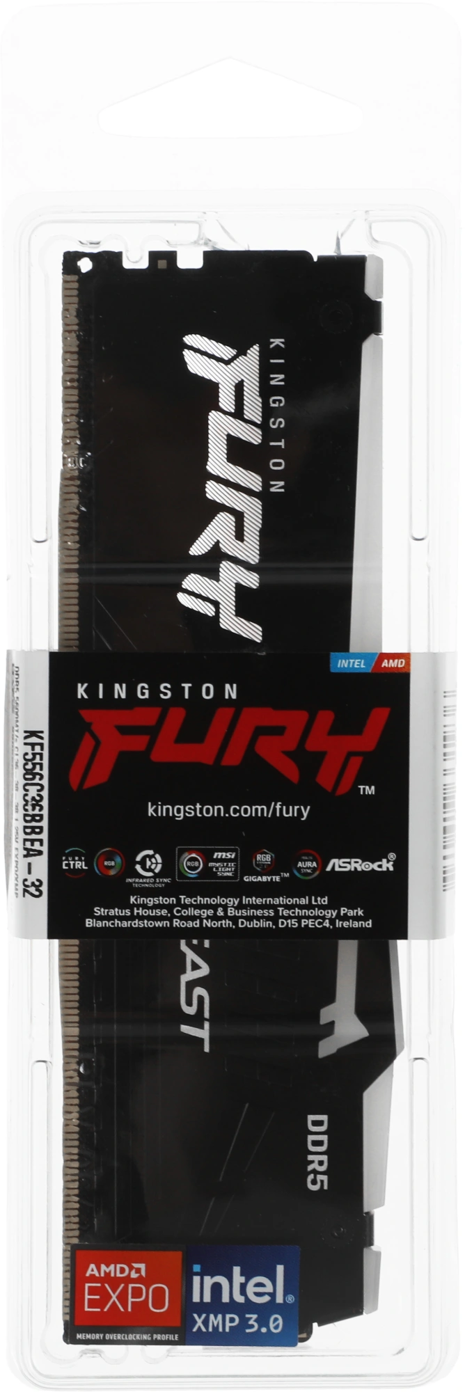 Модуль памяти Kingston 32GB DDR5 5600 FURY Beast Black RGB EXPO Non-ECC Unbuffered DIMM (Single Module) 2RX8 36-38-38 1.25V 288-pin 16Gbit (KF556C36BBEA-32)