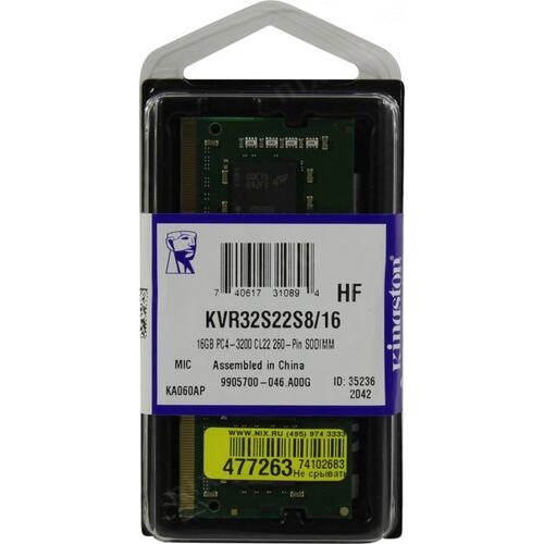 Модуль памяти Kingston DDR4 SODIMM 16GB KVR32S22S8/16 PC4-25600, 3200MHz, CL22