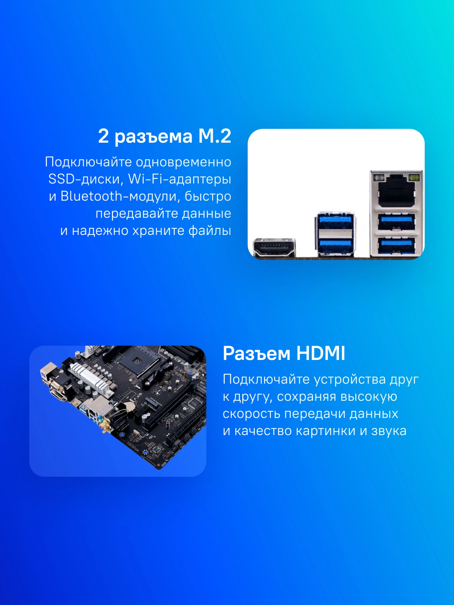 2 разъема M Key SATA/PCI-E с поддержкой карт Type 2242/2260/2280 (длиной до 80 мм)