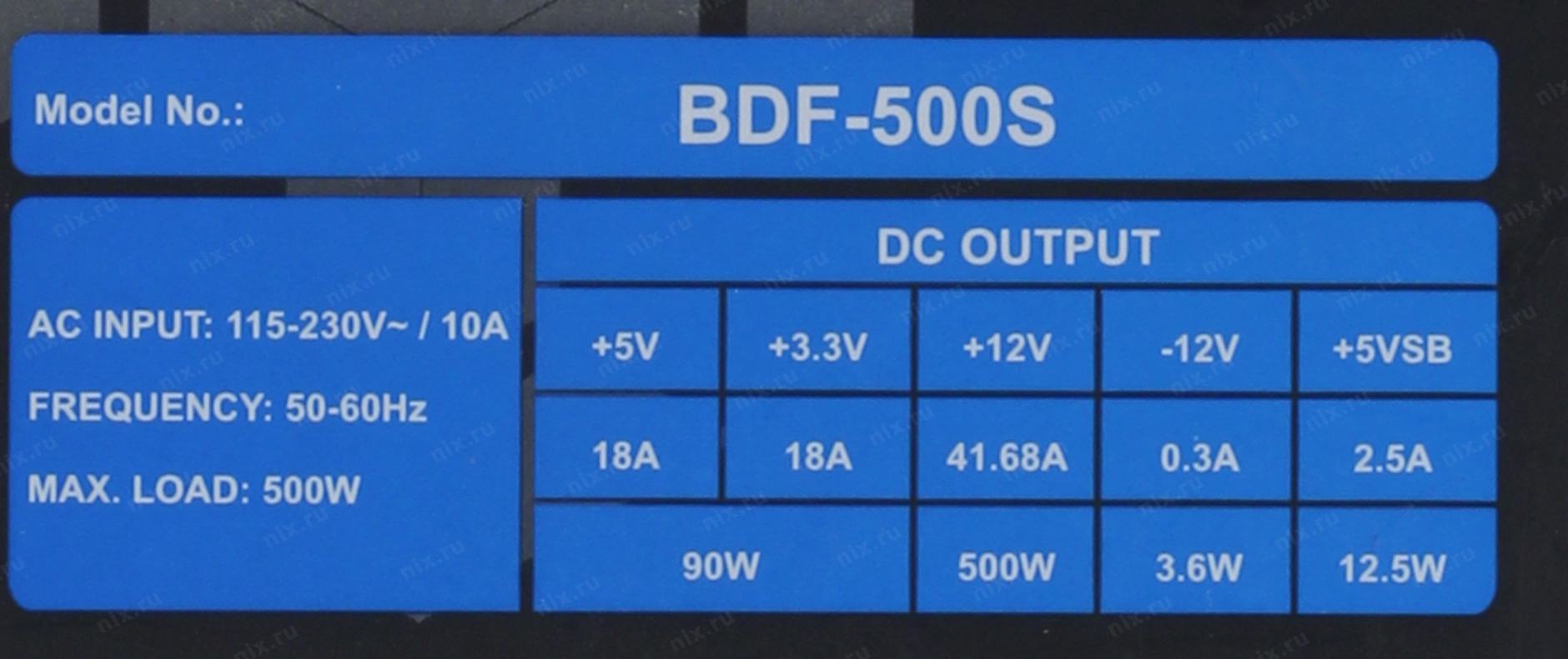 +3.3V - 18A, +5V - 18A, +12V - 41,68A, +5VSB - 2.5A, -12V - 0.5A ; Комбинированная нагрузка: +3.3V & +5V - 90 Вт