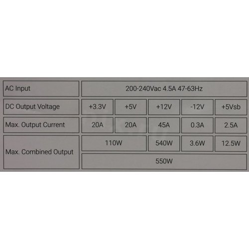 +3.3V - 20A, +5V - 20A, +12V -45A, +5VSB - 2.5A, -12V - 0.3A; Комбинированная нагрузка: +3.3V & +5V - 110 Вт