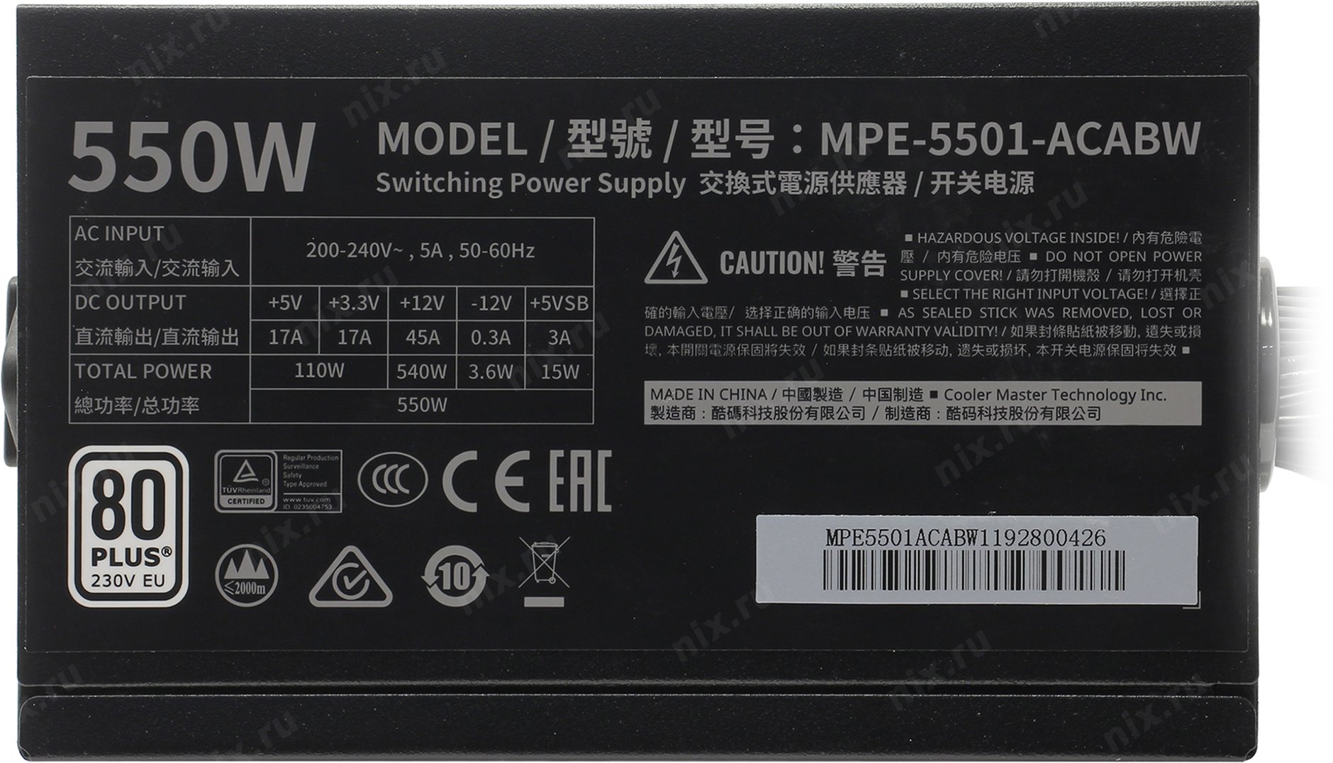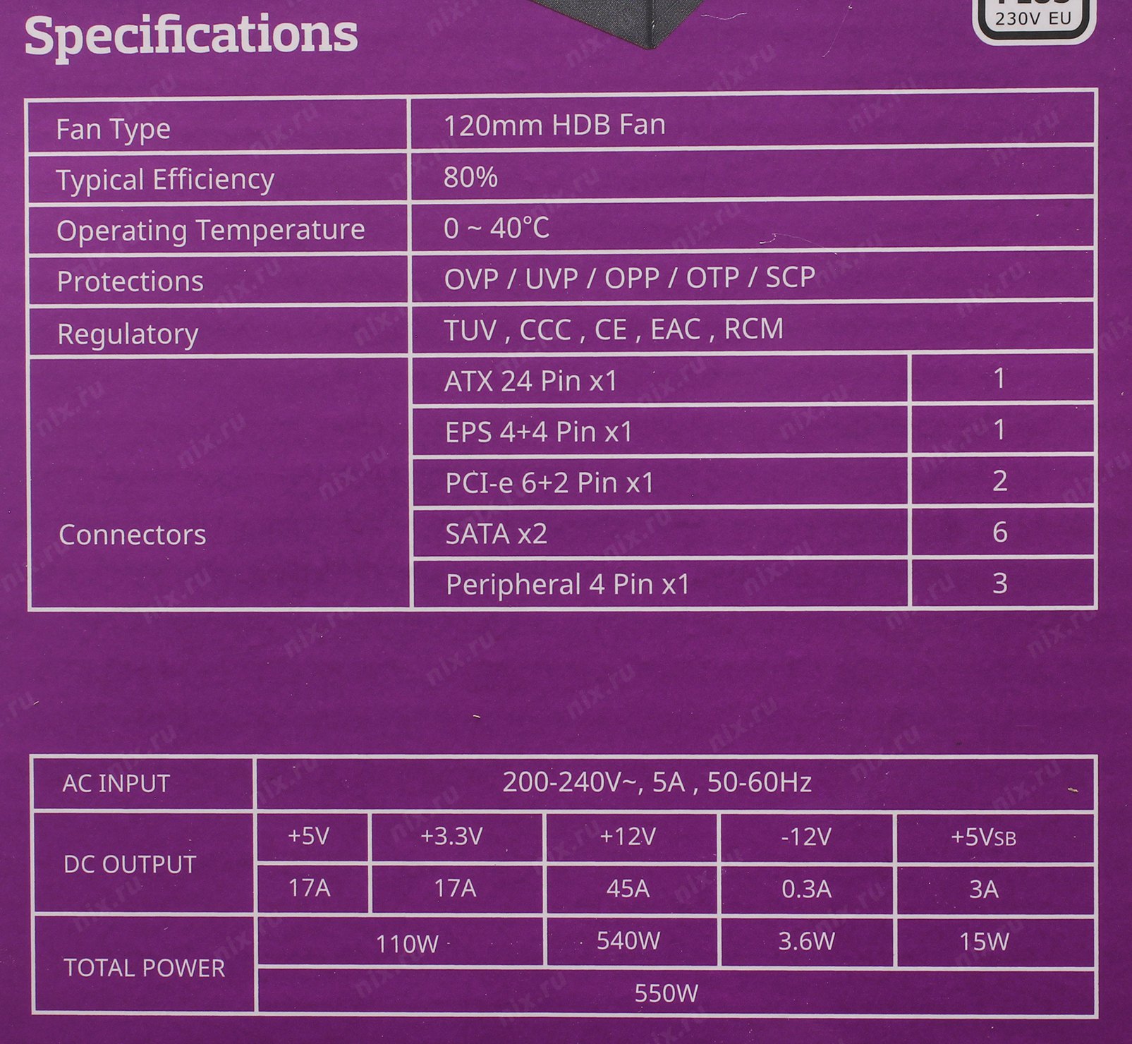 +3.3V - 17A, +5V - 17A, +12V - 45A, +5VSB - 3A, -12V - 0.3A; Комбинированная нагрузка: +3.3V&+5V - 110 Вт