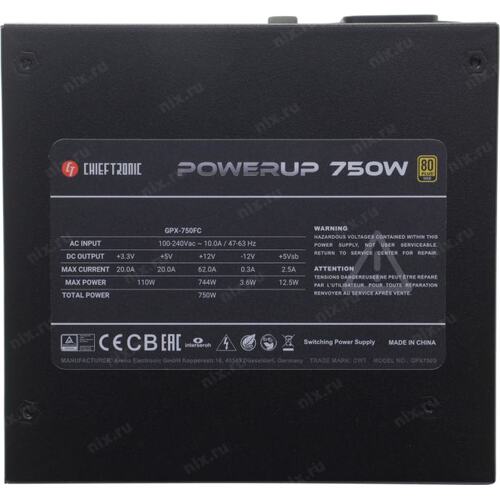 Блок питания Chieftec CHIEFTRONIC PowerUp GPX-750FC (ATX 2.3, 750W, 80 PLUS GOLD, Active PFC, 120mm fan, Full Cable Management, LLC design) Retail