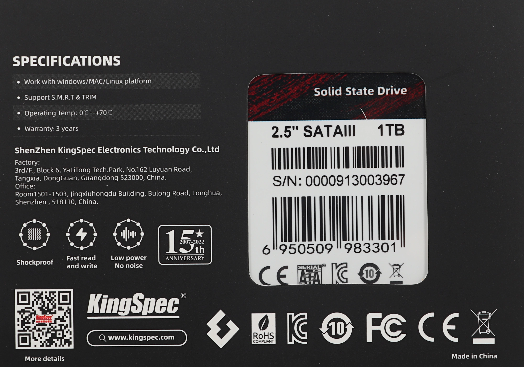 Твёрдотельный накопитель KingSpec SSD 1TB SATA III 2.5" R570/W560MB/s 3D NAND MTBF 1.5M 65000/70000 IOPS 480TBW <P3-1TB>
