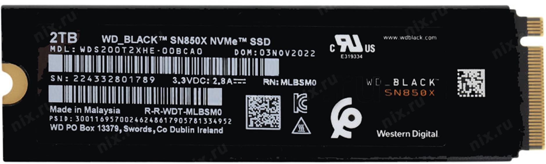 Твердотельный накопитель Western Digital Black SN850X SSD M2.2280 PCIe 4.0 2Tb, 7300MBs/6600MBs, TBW 1200, with heatsink, WDS200T2XHE