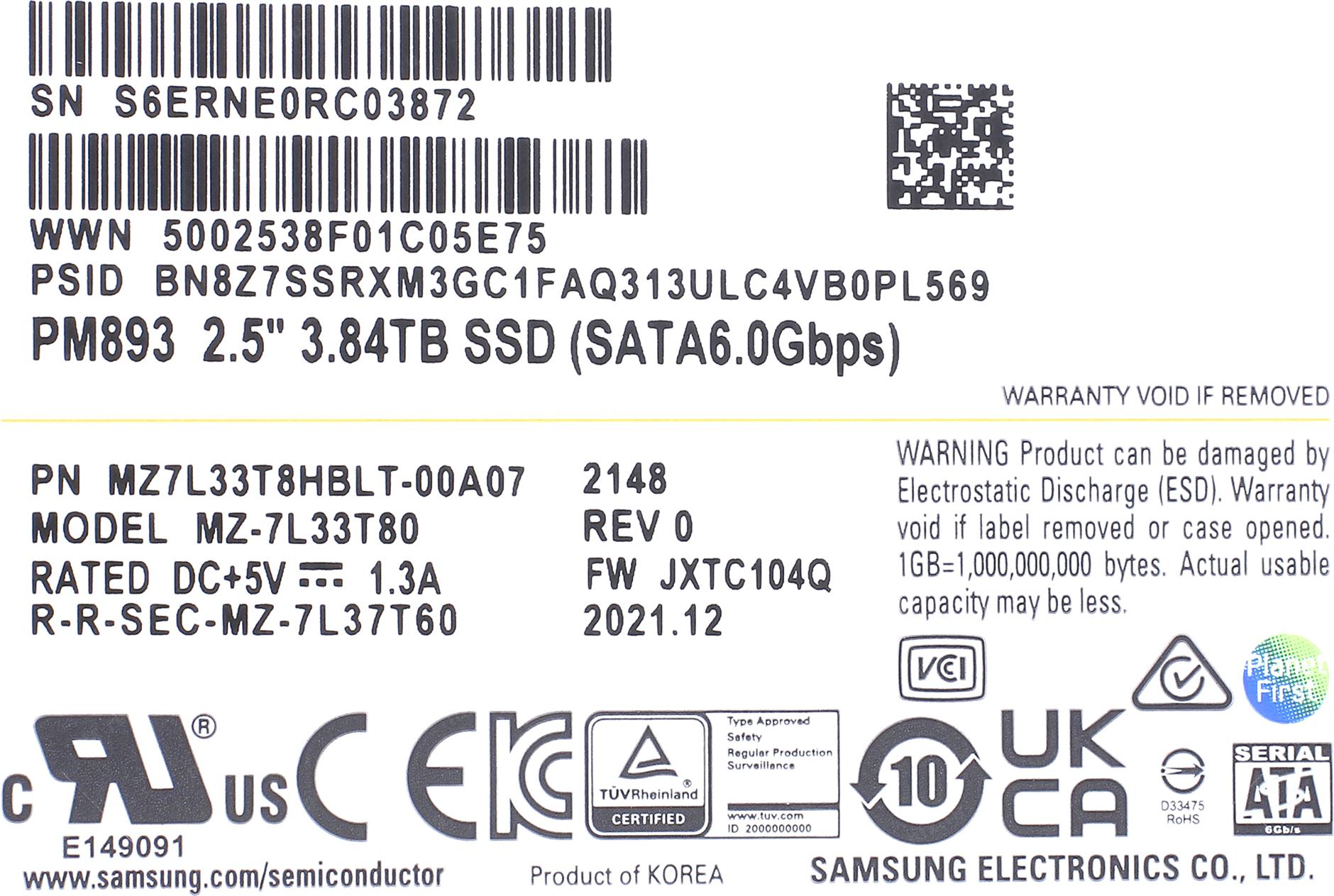 Накопитель SSD Samsung SATA-III 3.84TB MZ7L33T8HBLT-00A07 PM893 2.5" 1 DWPD OEM | НИКС Екатеринбург