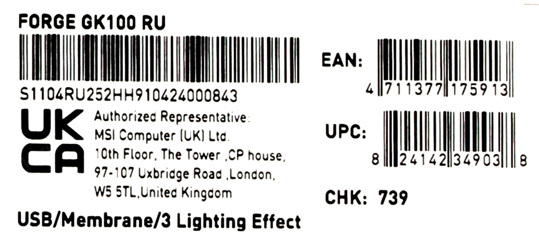 Клавиатура MSI FORGE GK100 RU черный USB for gamer LED (S11-04RU252-HH9) кабель 1.5м