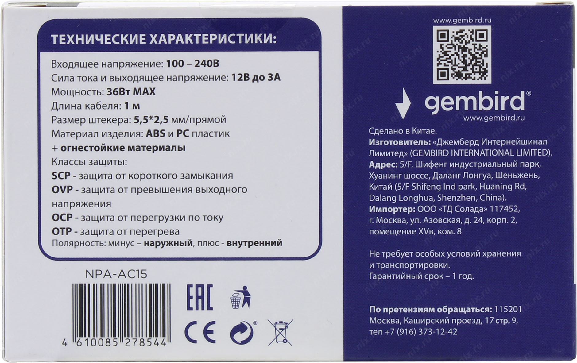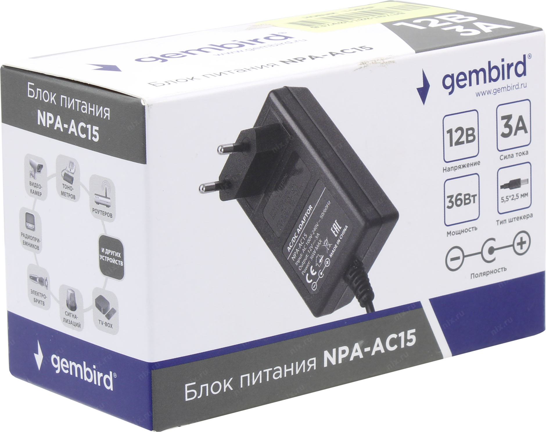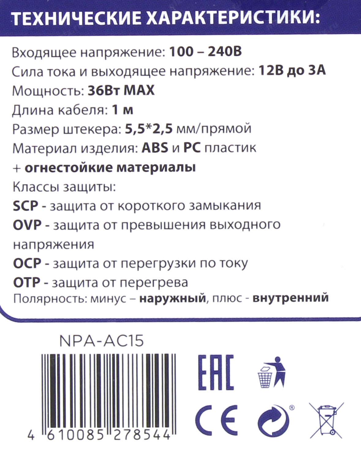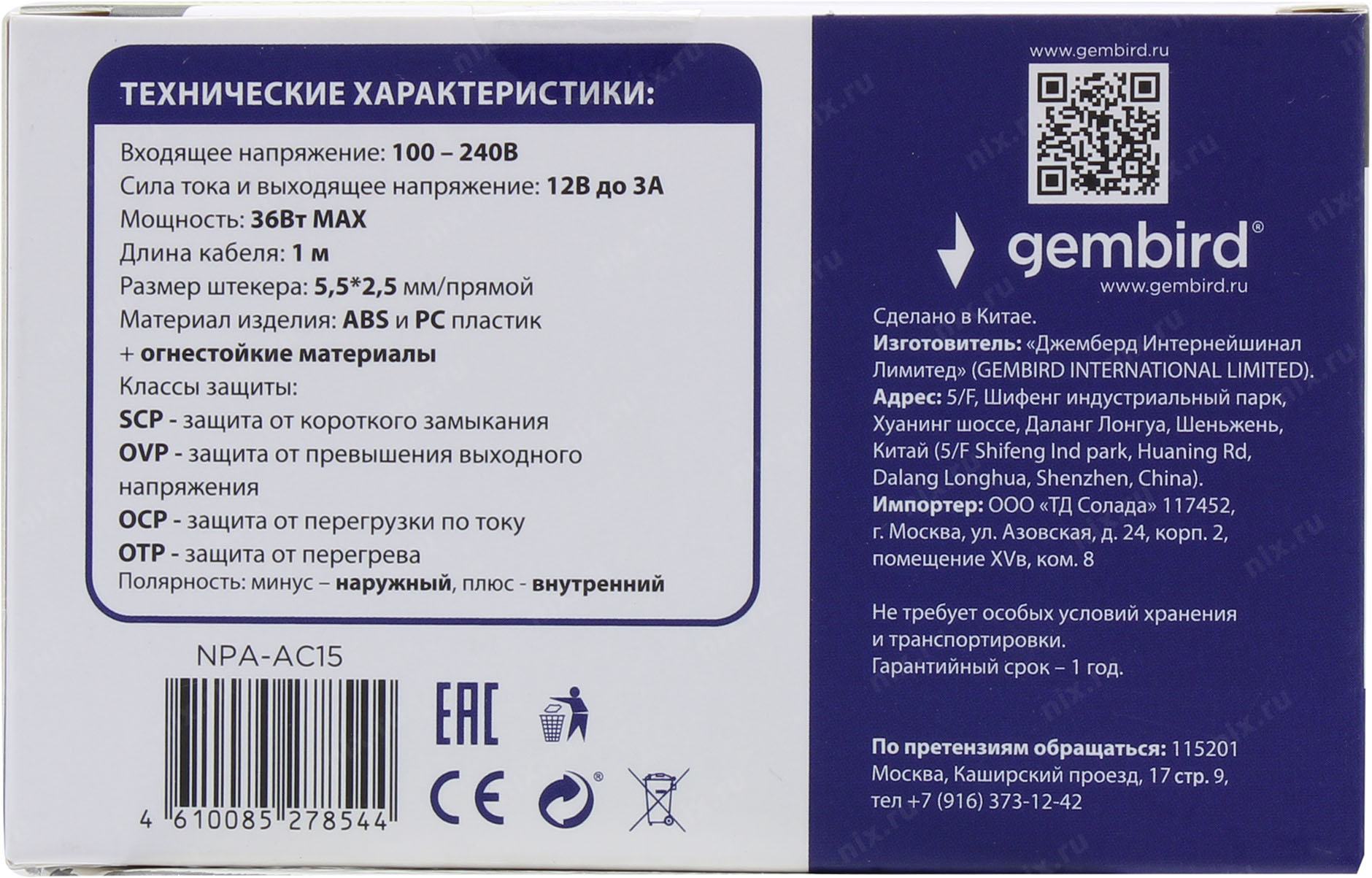 Аксессуар к ноутбуку Gembird Блок питания 12В/3А, 36Вт, 1 штекер 5,5х2,5мм (NPA-AC15)