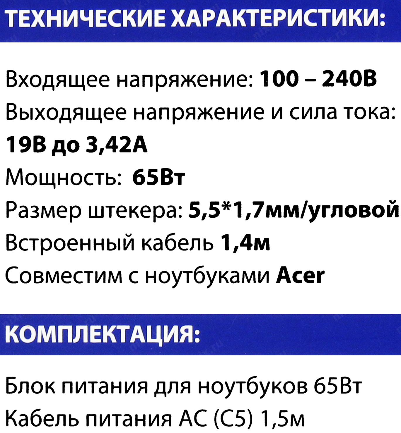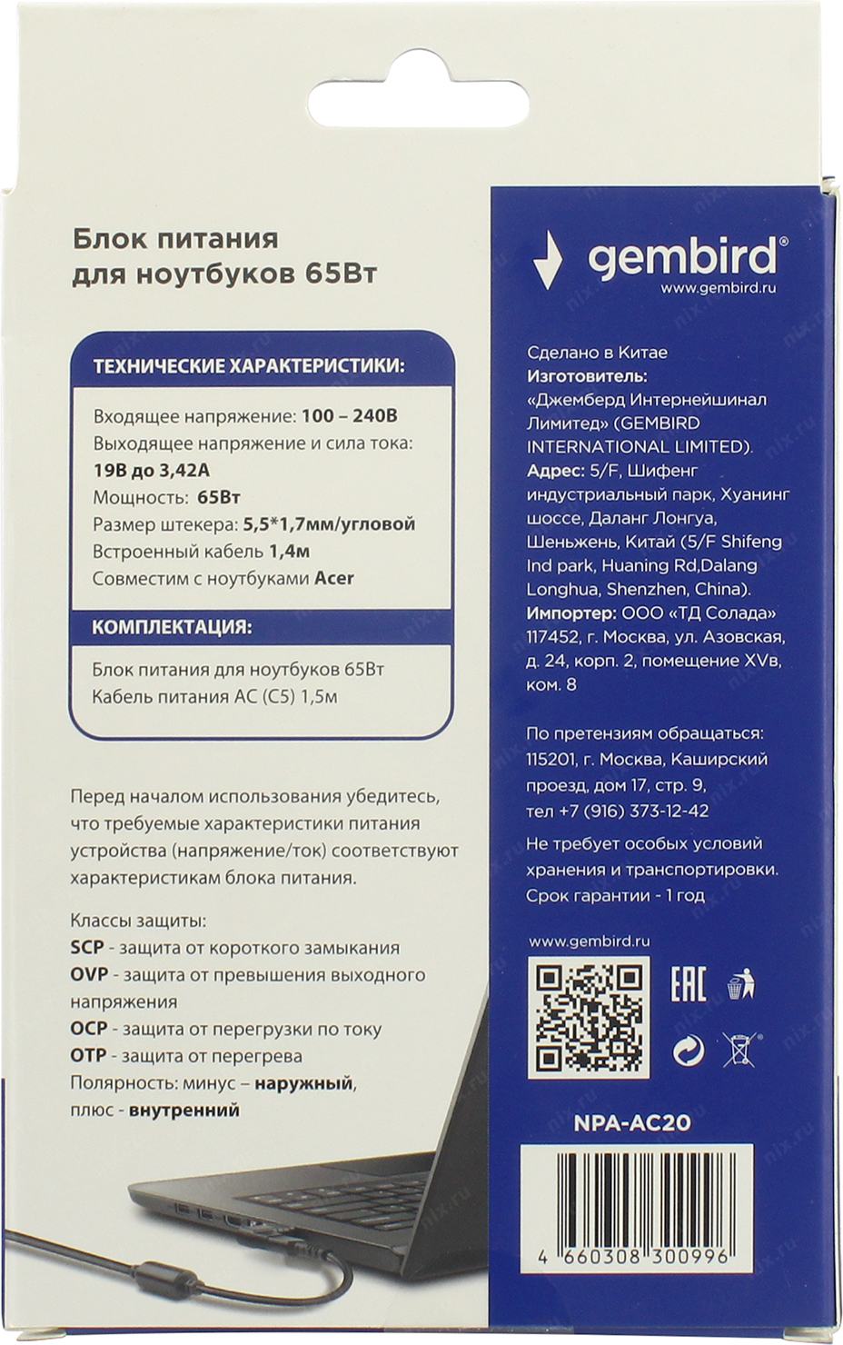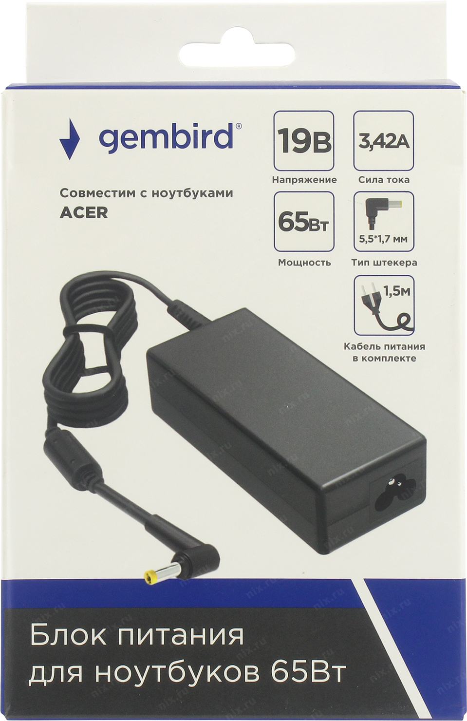 Gembird Блок питания для ноутбуков Acer 19В/3,42А, 65Вт, 1 штекер (5,5х1,7мм 9м)