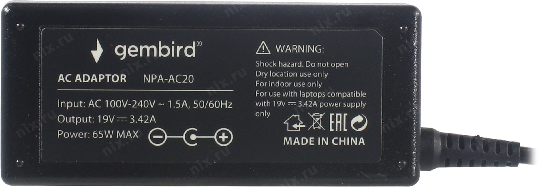 Аксессуар к ноутбуку Gembird Блок питания для ноутбуков Acer 19В/3,42А, 65Вт, 1 штекер (5,5х1,7мм 9м) [NPA-AC20]