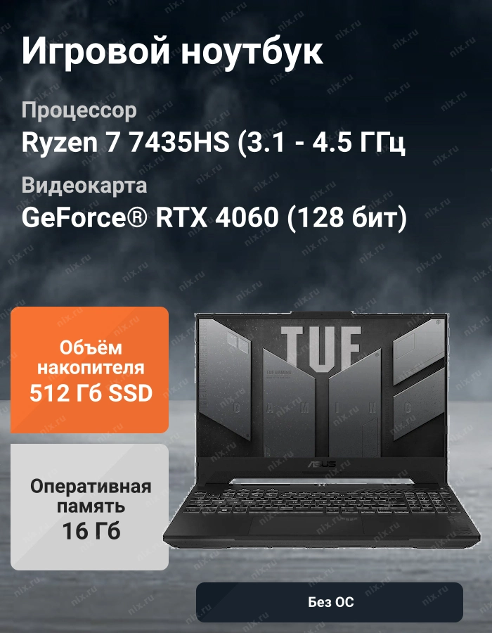Ноутбук ASUS TUF Gaming FA507NVR-LP040 [90NR0JK5-M00230] 15.6" (FHD Ryzen 7 7435HS/16Gb/SSD512Gb/RTX4060 8Gb/noOS)