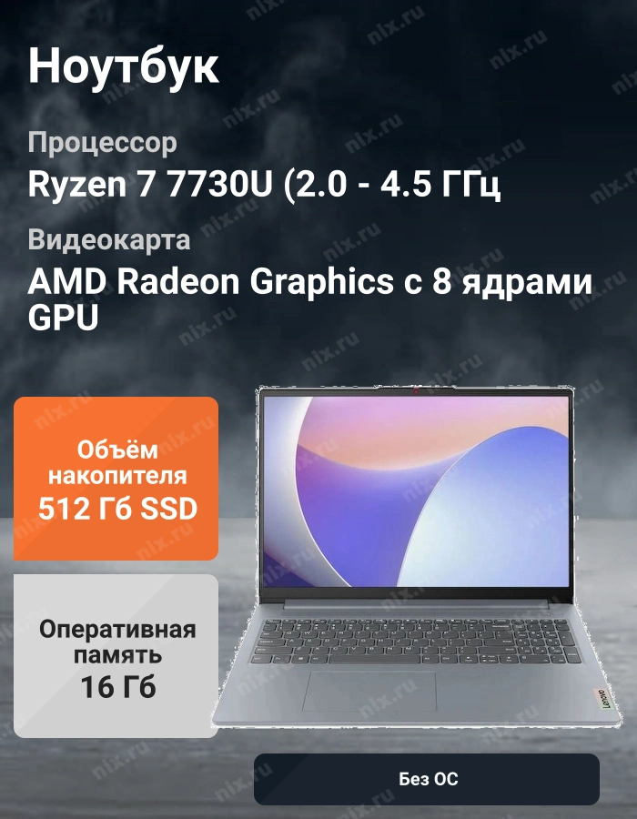 Ноутбук Lenovo IdeaPad Slim 3 15ABR8 Ryzen 7 7730U 16Gb SSD512Gb AMD Radeon Graphics 15.6" IPS FHD (1920x1080) без ОС grey WiFi BT Cam (82XM00CJRK)