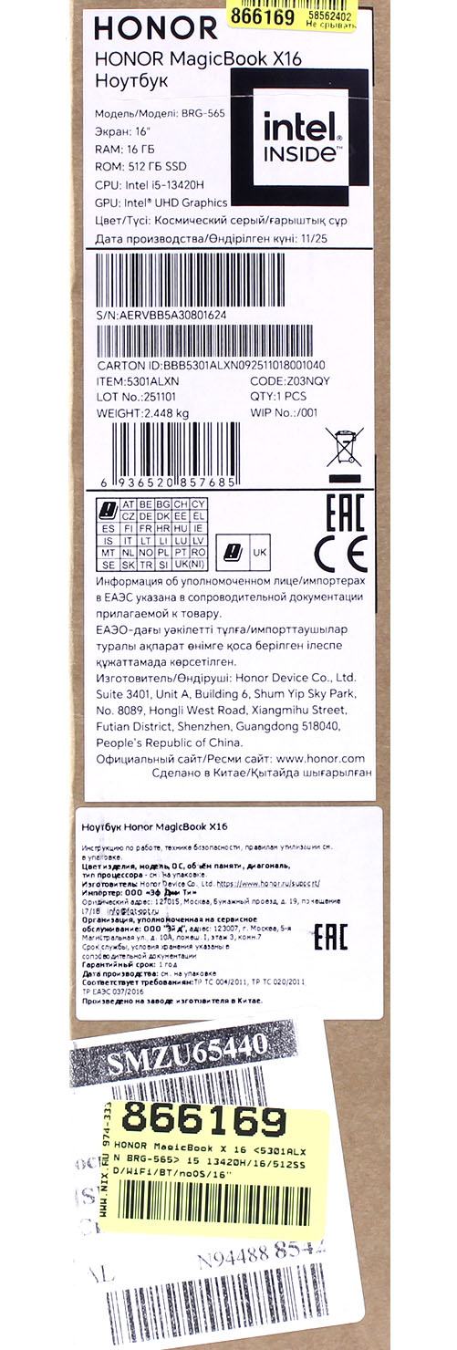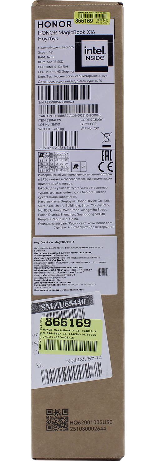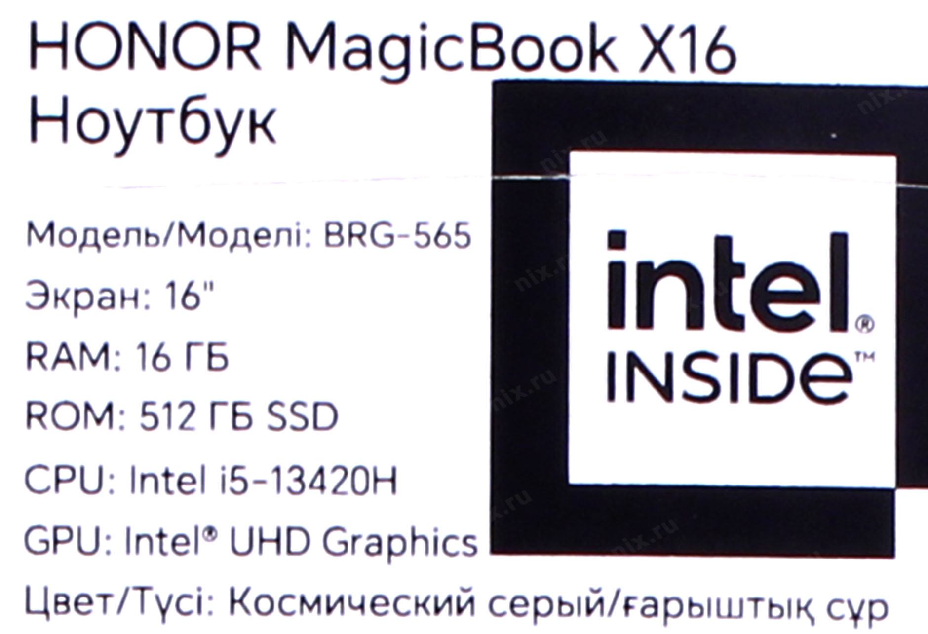 Ноутбук Honor MagicBook X16 BRG-565 Core i5 13420H 16Gb SSD512Gb Intel UHD Graphics 16" IPS FHD+ (1920x1200) FreeDOS grey WiFi BT Cam (5301ALXN)