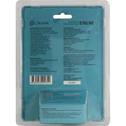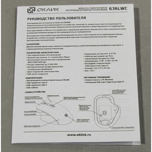 Мышь Оклик 636LWC черный оптическая 1600dpi беспров. USB/USB-C для ноутбука 6but (1158065) OKLICK